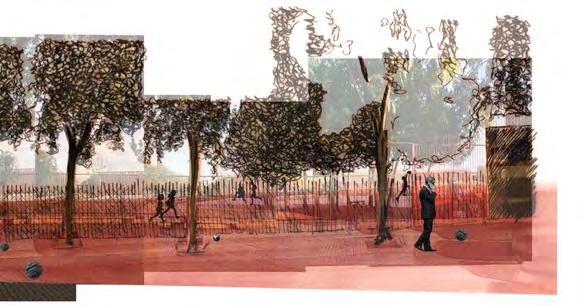 The introduction of vegetation in the form of urban gardens is intended to relate the street to its surroundings, emphasising the transition between urban space and the countryside. Taken out of its context and placed in this space, maintaining its geometry or adapting it to the space, the “orchard” element acts as a physical and visual connection between the street and the school and between the street and the sports centre.