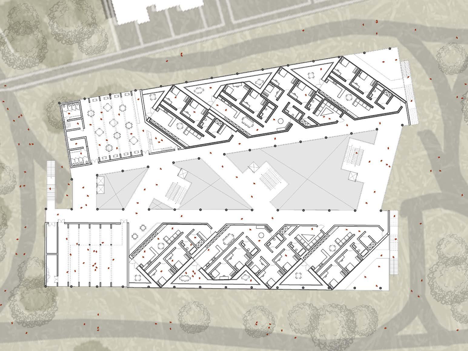 had experimented with raising the building height to around 6 storeys but found that was also inconsistent with the surrounding context. Based on the precedent of 79&Park, I rotated the residential blocks to maximise the amount of sunlight each unit would receive. made the blocks then tiered, to aid visual connection between spaces, and to block the southwest prevailing winds. Lastly, separated the two mirrored sides of the building to create a ground floor social circulation space that can be used as a market for people to sell either the produce they grow in their gardens or the work they create in the Arts Centre.