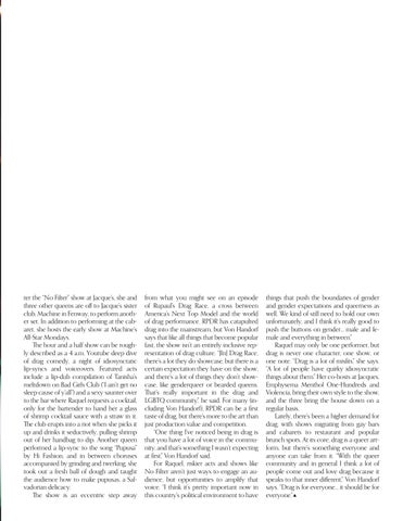from what you might see on an episode of Rupaul’s Drag Race, a cross between America’s Next Top Model and the world of drag performance. RPDR has catapulted drag into the mainstream, but Von Handorf says that like all things that become popular fast, the show isn’t an entirely inclusive representation of drag culture. “[In] Drag Race, there’s a lot they do showcase, but there is a certain expectation they have on the show, and there’s a lot of things they don’t showcase, like genderqueer or bearded queens. That’s really important in the drag and LGBTQ community,” he said. For many (including Von Handorf), RPDR can be a first taste of drag, but there’s more to the art than just production value and competition. “One thing I’ve noticed being in drag is that you have a lot of voice in the community, and that’s something I wasn’t expecting at first,” Von Handorf said. For Raquel, riskier acts and shows like No Filter aren’t just ways to engage an audience, but opportunities to amplify that voice. “I think it’s pretty important now in this country’s political environment to have