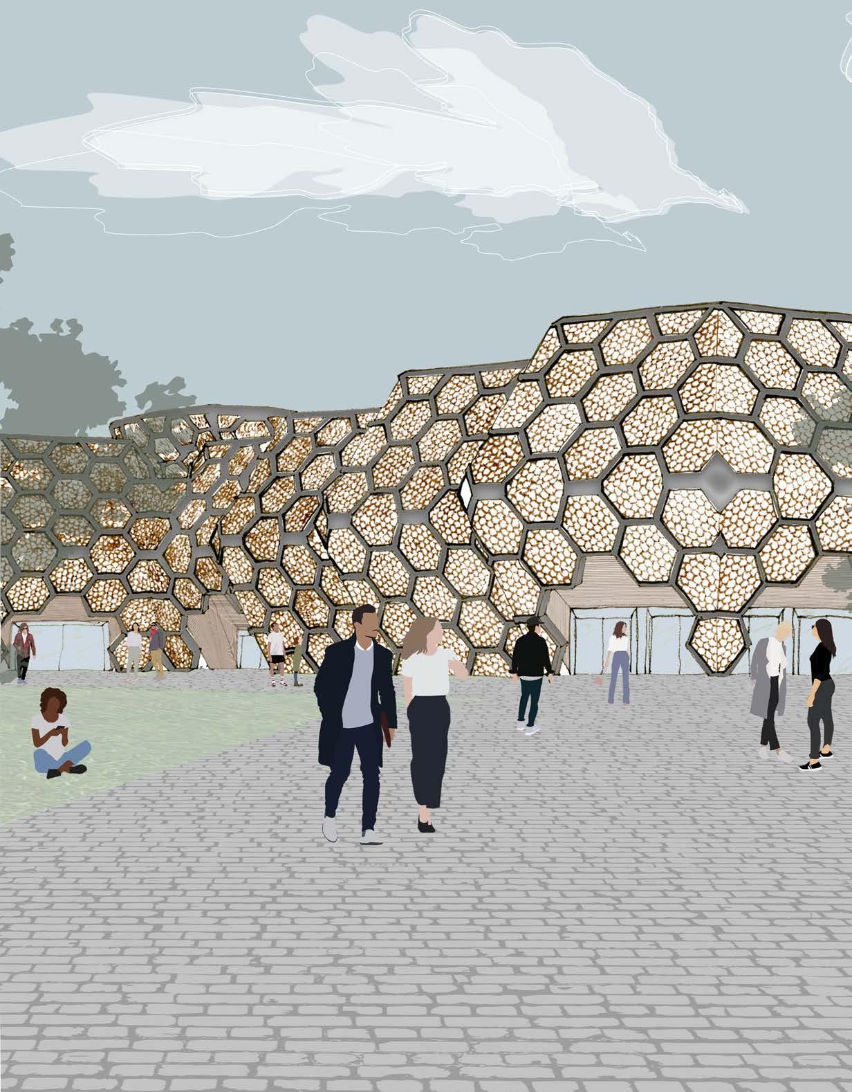 The Museum of Biomimicry in Design is created to complement the arts district in Fortworth Texas and live in harmony amongst its neighbors, the Museum of Modern Art and the Kimbell Art Museum. Each gallery explores how principles in nature are applied to products we use in our daily lives. For example, Velcro was invented by George de Mestral, a Swiss engineer when he was hiking with his dog in the woods. When they returned home, his dog had a variety of burrs stuck to him. Off of this principle, Mr. Menstal invented Velcro. In my design I was strongly influenced by the many places we see the hexagon in nature from the smallest polymer-molecule to rock formations in Ireland. This was applied in the exposed structure as well as the exterior insulated panels. These two systems, the structures and the skin, work together to make the organism that is this museum.