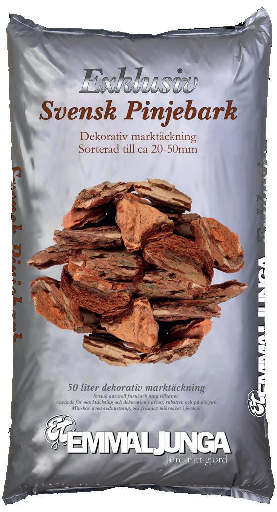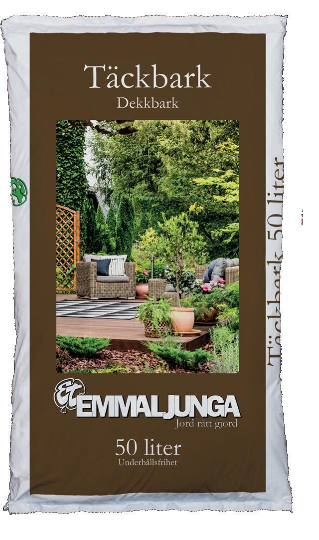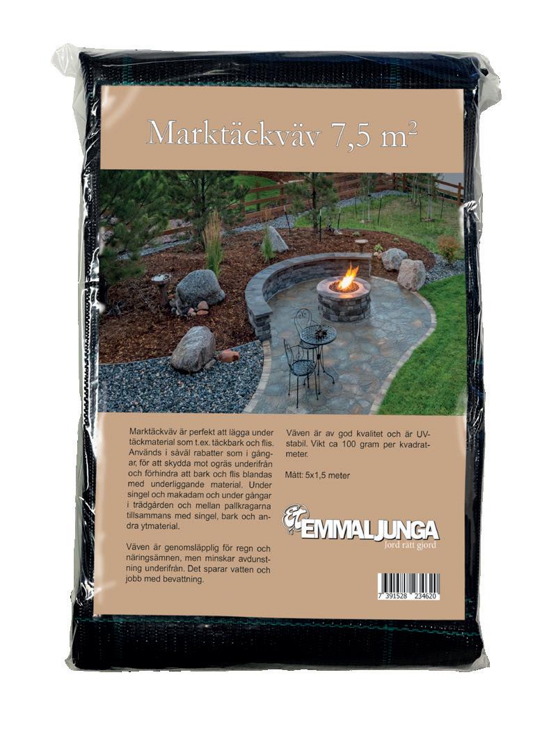 Till gångar och större ytor rekommenderar vi att man lägger marktäckväv under barken för att skydda mot rotogräs och förlänga hållbarheten på barken. Mer info finns på sidan 36