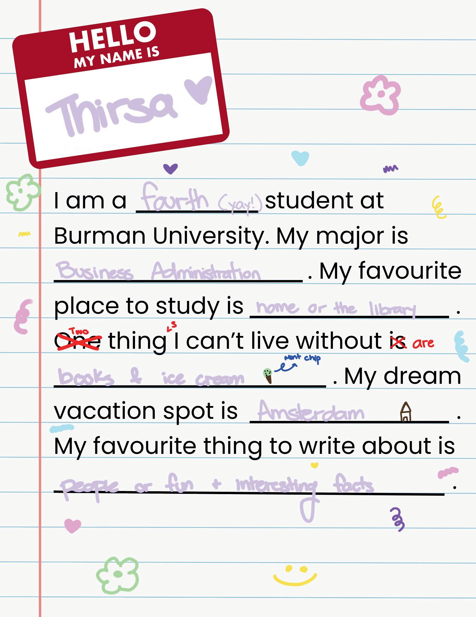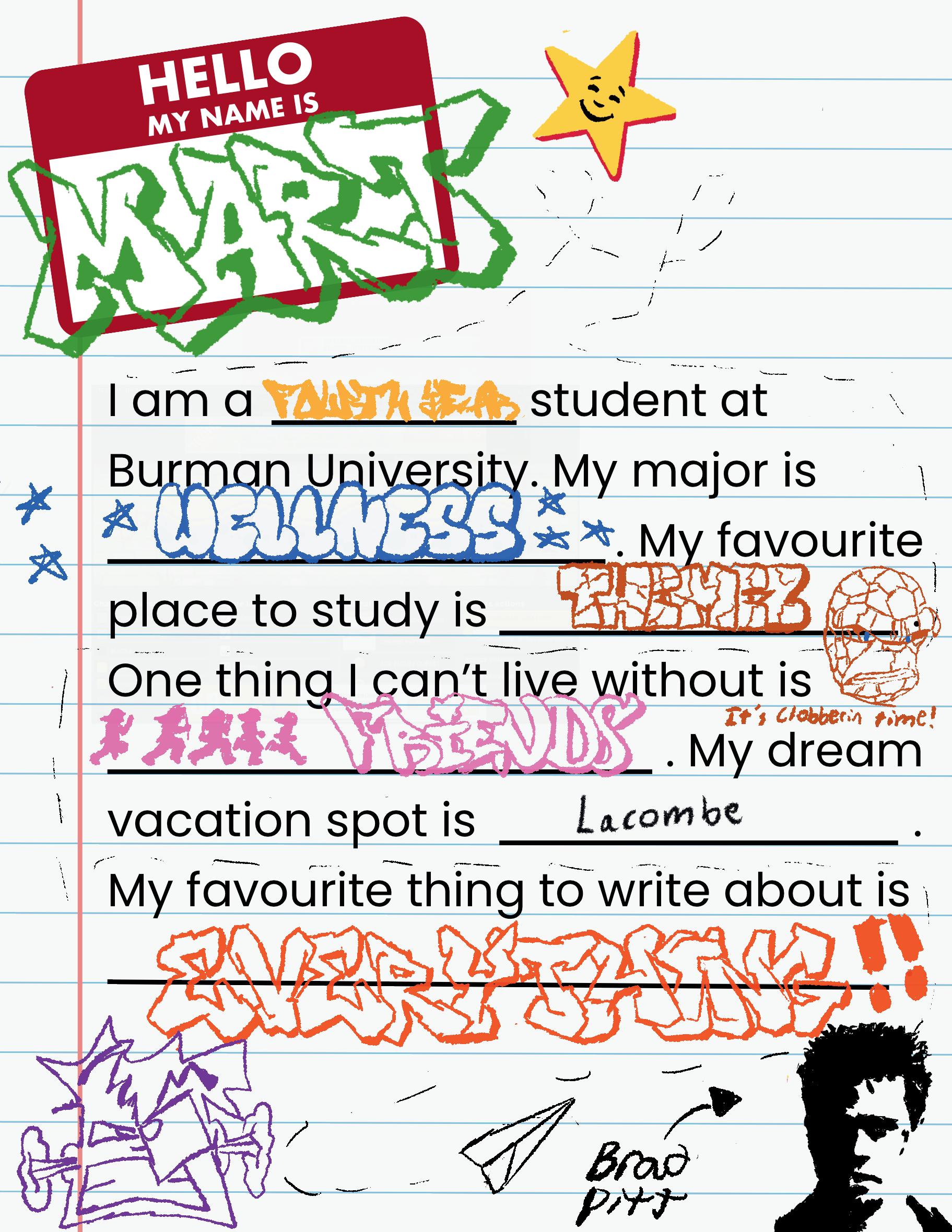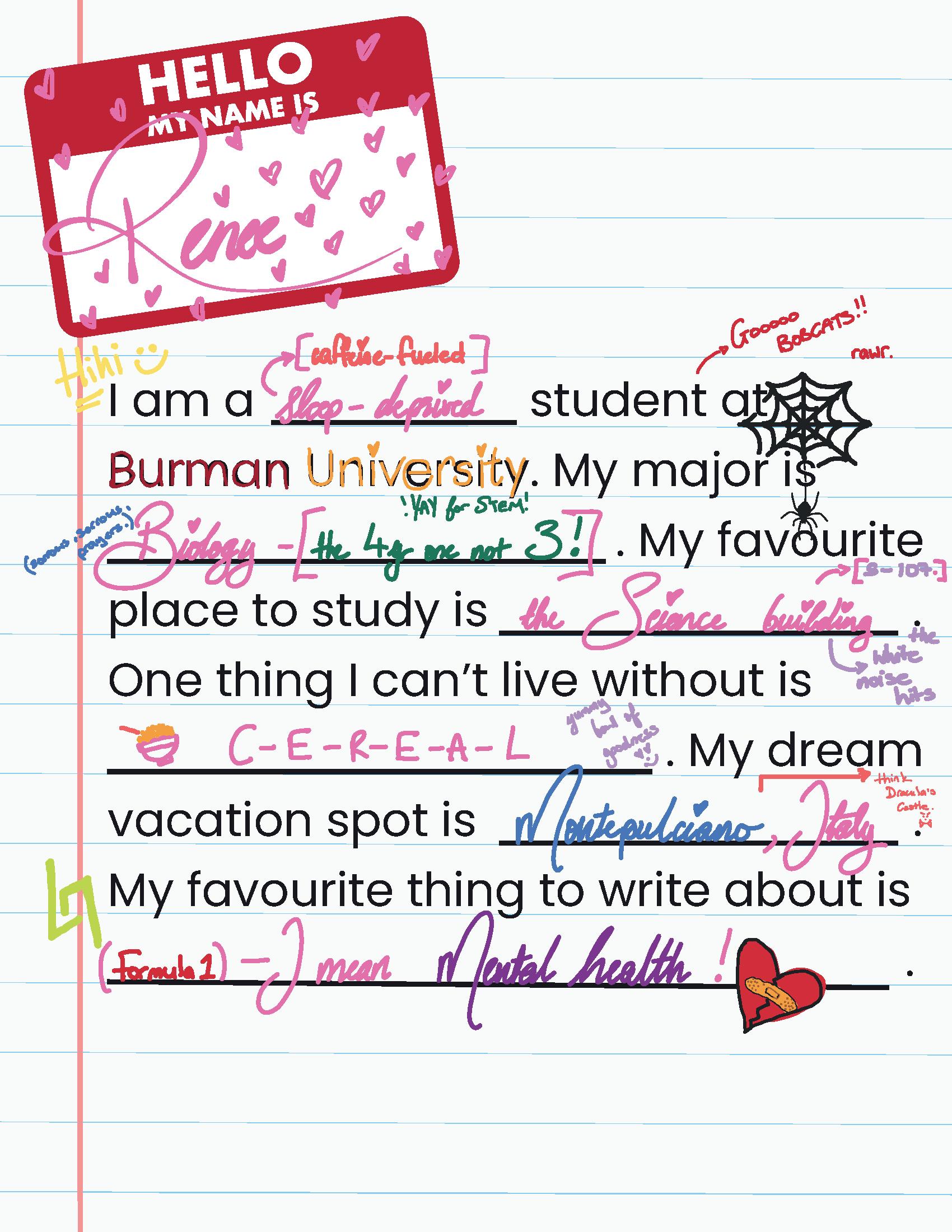 As I enter into my final year at Burman and as the editor of this silly little paper, it has really become clear to me how much solidarity we all have in that. As you look around at your peers, know that we all share the same doubts and worries for our future, and we all have aspirations and goals that can feel out of reach at times. Let’s be there for each other, uplift each other, and give each other grace in this turbulent time of our lives.
