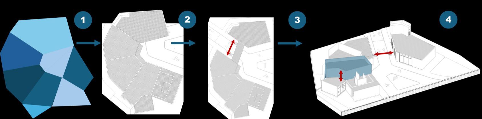 El uso del sistema Voronoi proporciona una organización espacial eficiente, adaptable y estéticamente atractiva. El desarrollo del proyecto se basa en este sistema, se adecuaron algunos ejes y orientaciones de las formas para poder permitir satisfacer las necesidades analizadas en la investigación de áreas, espacios y recorridos.