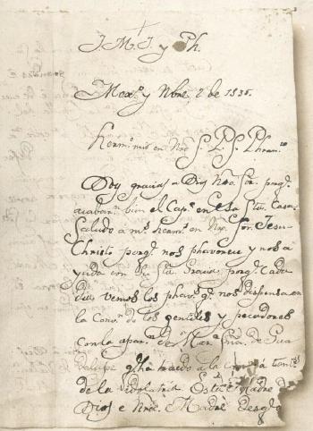 Doy gracias a Dios nuestro señor porque acabaron bien el capítulo en esa santa casa. Saludo a nuestros hermanos en nuestro señor Jesucrhristo porque nos phavorece y nos ayuda con su santa gracia, porque cada día vemos los phavores que nos dispensa en la conversión de los gentiles y pecadores, con la aparición de María santísima de Guadalupe, que ha traedo a la conversión a tantos de la idolatría. Esta madre de Dios e nuestra madre des que a […] //1v en el nuestro oratorio e agora en la santa catedral, se están phaciendo grandes e muchos milagros de alma e de cuerpo. Ya está acabada la capilla del cerro de Tepeyacatl para colocar a la Virgen santísima, e mi mayor deseo es que vuestra paternidad muy reverendísima me acompañe juntamente con los prelados que agora hoviérede en el convento para pasar la sagrada imagen a la dicha capilla e nos acompañar tanvién los hermanos fray Martín de La Coruña, fray Antonio de Segovia e fray Bernardo, que agora están en esa santa casa.