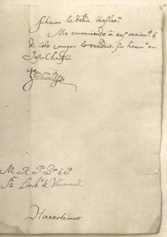 No se olvide de pedir a Dios por nuestro hermano fray Martín de Valencia. Espero las letras de vuestra paternidad muy reverendísima para disponer el día en que havremos de //2r phacer la dicha traslación. Me encomiendo a sus oraciones e de todo corazón lo vendice su hermano en Jesuchristo