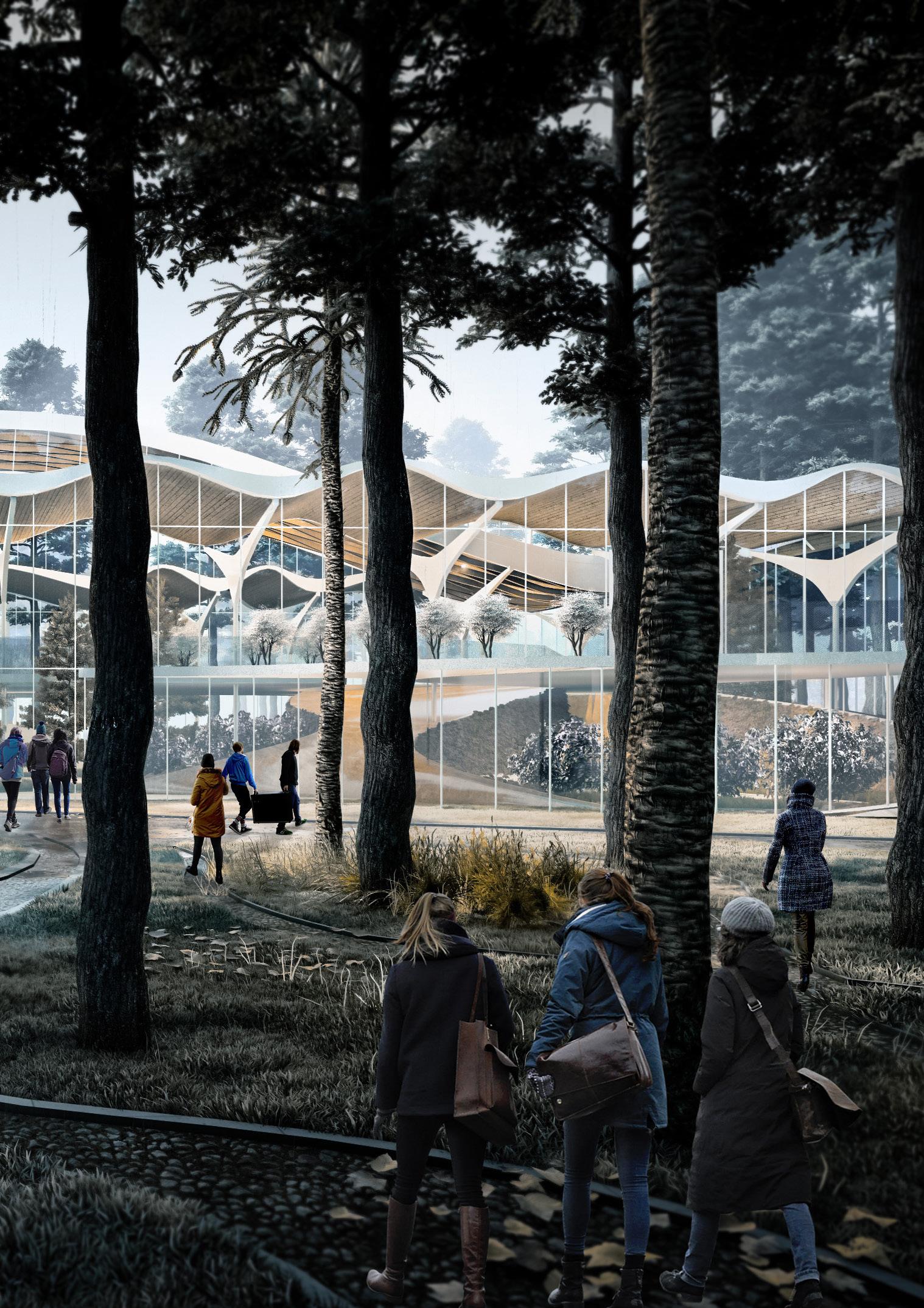 Die örtliche Natur ist als Formgeber gedacht: Der experimentelle Prozess, der auf die Integration der örtlichen Bäume abzielt, führt zum endgültigen Entwurf.