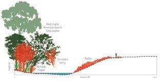 The target species for the forest restoration is based on a forest association native to Maryland. Some areas are first planted as meadows and transitioned to forests by managed succession. Areas where visibility is necessary are maintained as meadows interspersed with large shade trees.