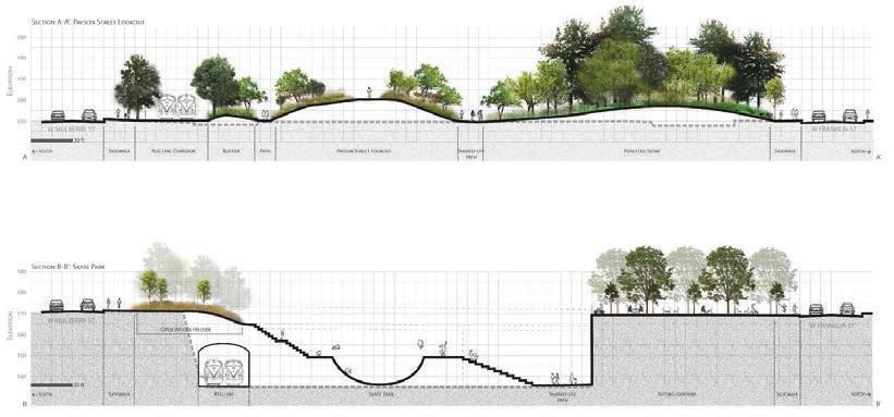 The planned (unbuilt) Baltimore Red Line light rail runs through the site. The design includes meadows, forested berms, and shrublands, space designated for local businesses, a community library, horse stables to uphold a fading part of West Baltimore’s history, community greenhouse and gardens, and a wide variety of recreational resources.