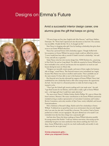 Designs on Emma’s Future Amid a successful interior design career, one alumna gives the gift that keeps on giving “I’ll never forget my first class: English with Miss Prescott,” said Nancy MullanDemirjian ’58. “Never had I experienced class discussion at that level. The curiosity was incredible. I finally felt like I fit in. It changed my life.” Now Nancy is changing other girls’ lives by funding a scholarship that gives them access to an Emma Willard education. Nancy has a personal history with scholarship support. Though thrilled with her acceptance to Emma Willard, her parents simply could not afford the tuition. “I never would have been able to attend if I hadn’t received a scholarship,” she said. “I was, and still am, so grateful.” Today Nancy owns her own interior design firm, NDM Kitchens Inc., practicing in New York City and on Long Island. The skills she acquired at Emma Willard have been invaluable to her, and not just because she was exposed to so much art and beauty during her years on Mount Ida. “Designers are naturally creative people, and many of them neglect the business side of things,” noted Nancy. “But financial matters never intimidated me, largely because Miss Harner was such an excellent math teacher. That is probably one of the main reasons I’ve been able to stay in this business for twenty-five years.” Her financial savvy has also informed her support of Emma Willard. Nancy had established her own scholarship fund to offer other young women the opportunity she had—but she wasn’t in a financial position to make the fund as large as she wanted it to be. “Then I got the School’s gift annuity mailing and it just made sense,” she said. “I get fixed income for my lifetime, and I’m able to make a gift to Emma Willard now—a far larger gift than I could have made otherwise.” The most recent Nancy F. Mullan Scholar, Kaitlin Phillips ’09, came to Mount Ida from Lewiston, Montana. Her many contributions to the Emma Willard community included serving as student representative to Curriculum Committee and Conduct Review Committee, and as key member of Quiz Team, varsity volleyball, and Annual Fund phonathons. Now a freshman at Barnard College, Kaitlin said of her scholarship to Emma Willard, “It allowed me to spend four years in an environment that not only shaped who I am now, but also who I would like to become. The teachers I had at Emma pushed me to think, not just regurgitate. My peers allowed me to be myself. I am reminded every day that these things were a spectacular gift.” And how does Nancy feel about making an Emma Willard education possible for young women like Kaitlin? “I will say, without reservation, that setting up this scholarship has given me more satisfaction than almost anything else I have ever done. Emma Willard did so much for me, both intellectually and socially. It only makes sense for me to give back.”