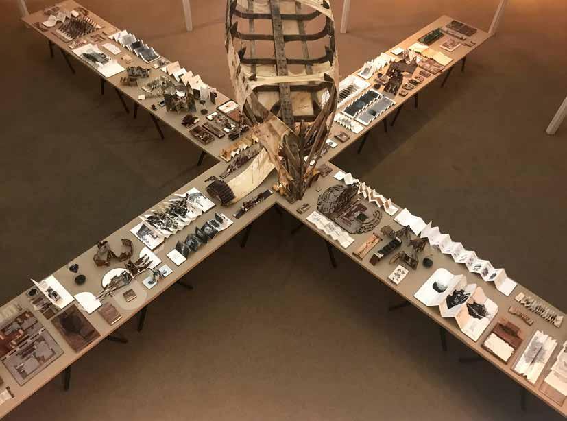 The covers of each book have been constructed from parquet floor blocks. When the covers are opened, its body unfolds in a concertina, which forms the pages of the book. The abstract visual narratives of the books’ contents refer to houses, boats, or fragments and remnants of found imagery and objects. The deliberate omission of reference to the human form places emphasis on the poignancy of human absence following a displacement event, along with the residual sense of loss.