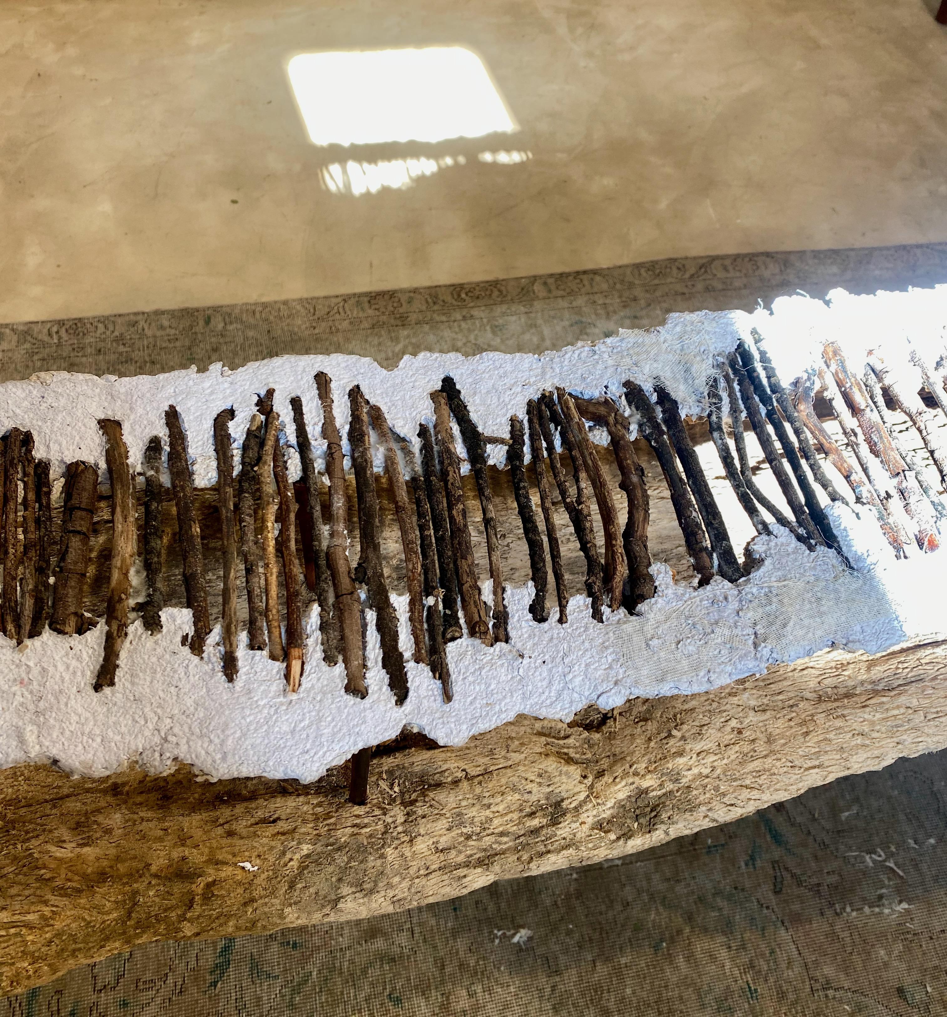 A raft has connotations to a hastily constructed, makeshift canoe or boat, usually assembled as a rescue vehicle after a disaster. In my version, a fragment of a dug-out canoe is carrying rows and rows of sticks, held together with paper pulp.