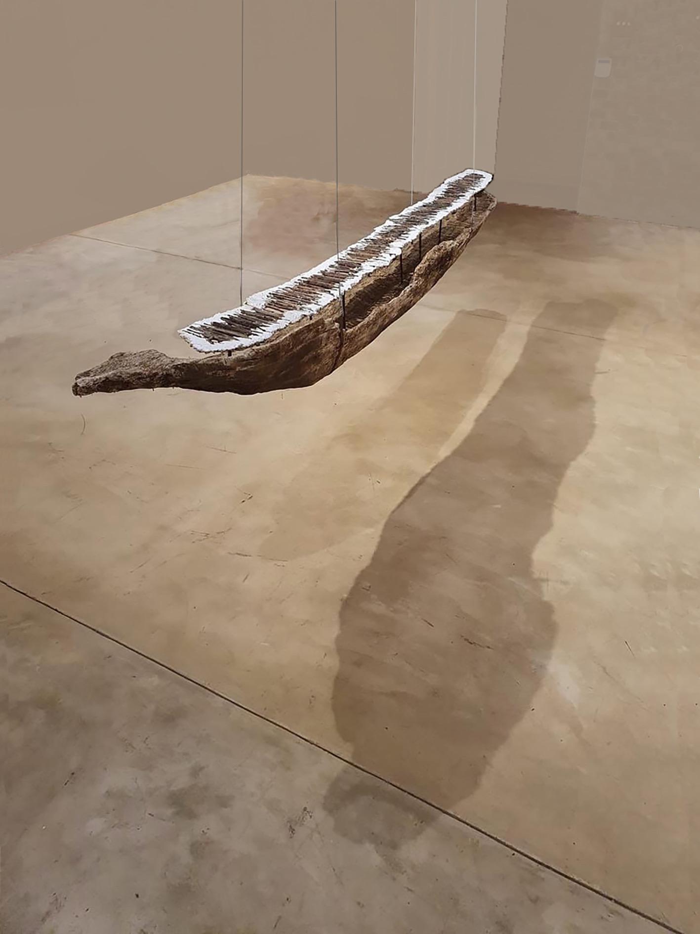 The Wake juxtaposes a decayed dugout canoe with a paper pulp drawing on scrim fabric, which was created by closely observing the wood remnant. The semi-transparent ghost-like drawing hovers over the wooden piece like a trace, suggesting a spiritual journey of remembrance or reverence.