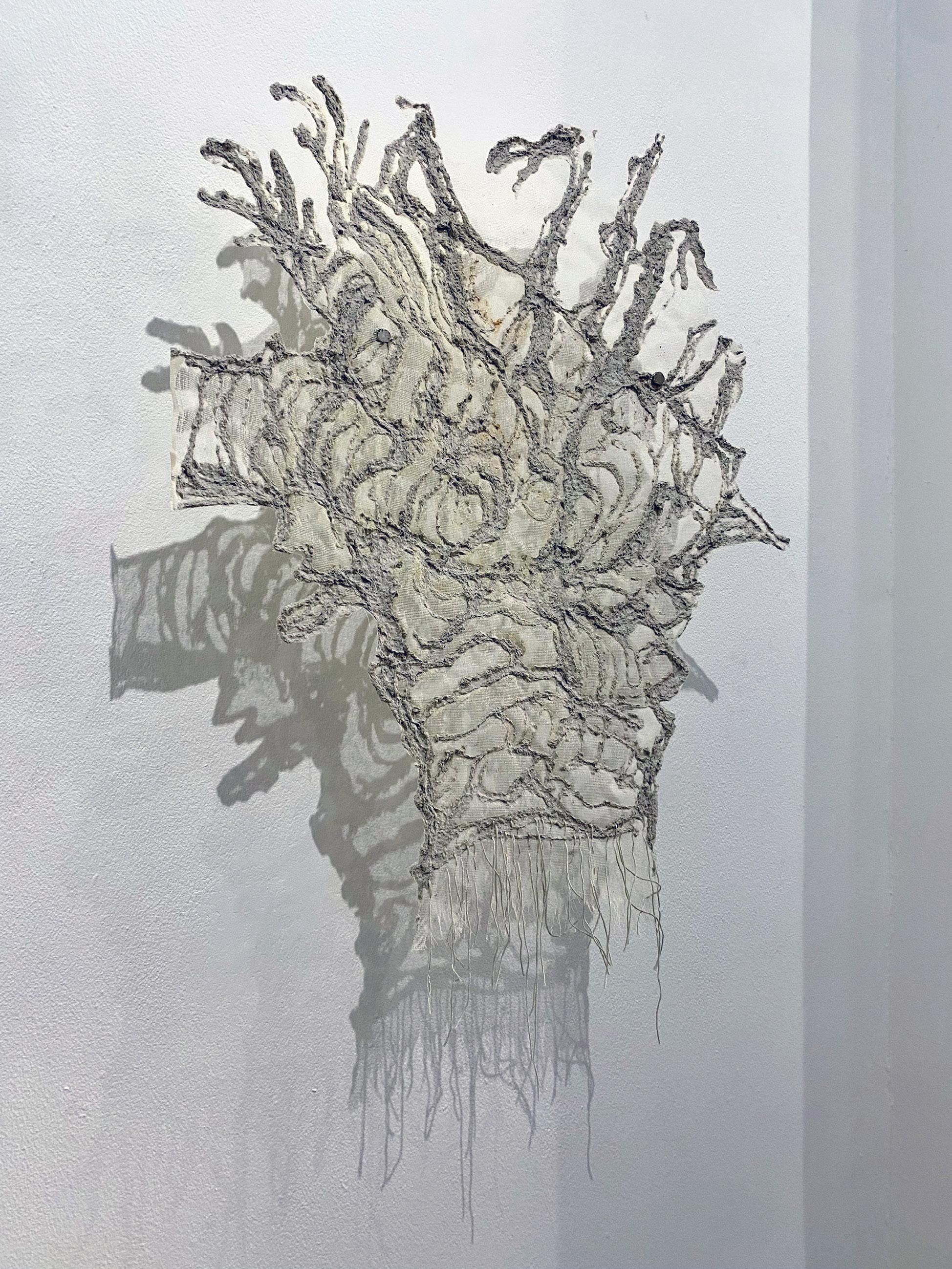 The tree stump that is used as reference in the Elegyforadeceasedtree – series, is a remnant of a found uprooted tree that shows evidence of having gone through a fire. I have used monotype printmaking techniques to create a series of commemorative ‘portraits’ of this tree stump. By adding cotton stitching into the paper, as a way of traversing the topographic structure and mapping the surface of the stump, I attempt to reconnect with and honour the memories of the deceased tree. In the work entitled A mere breath, I have made a paper pulp drawing of the tree stump on scrim fabric. The paper pulp was made with tearing up discarded documents and educational material from a school in Cape Town. As such, A mere breath is allowing the discarded knowledge to live on in an image of a tree stump, realigning the material (paper) with a fragile representation of its source (wood).