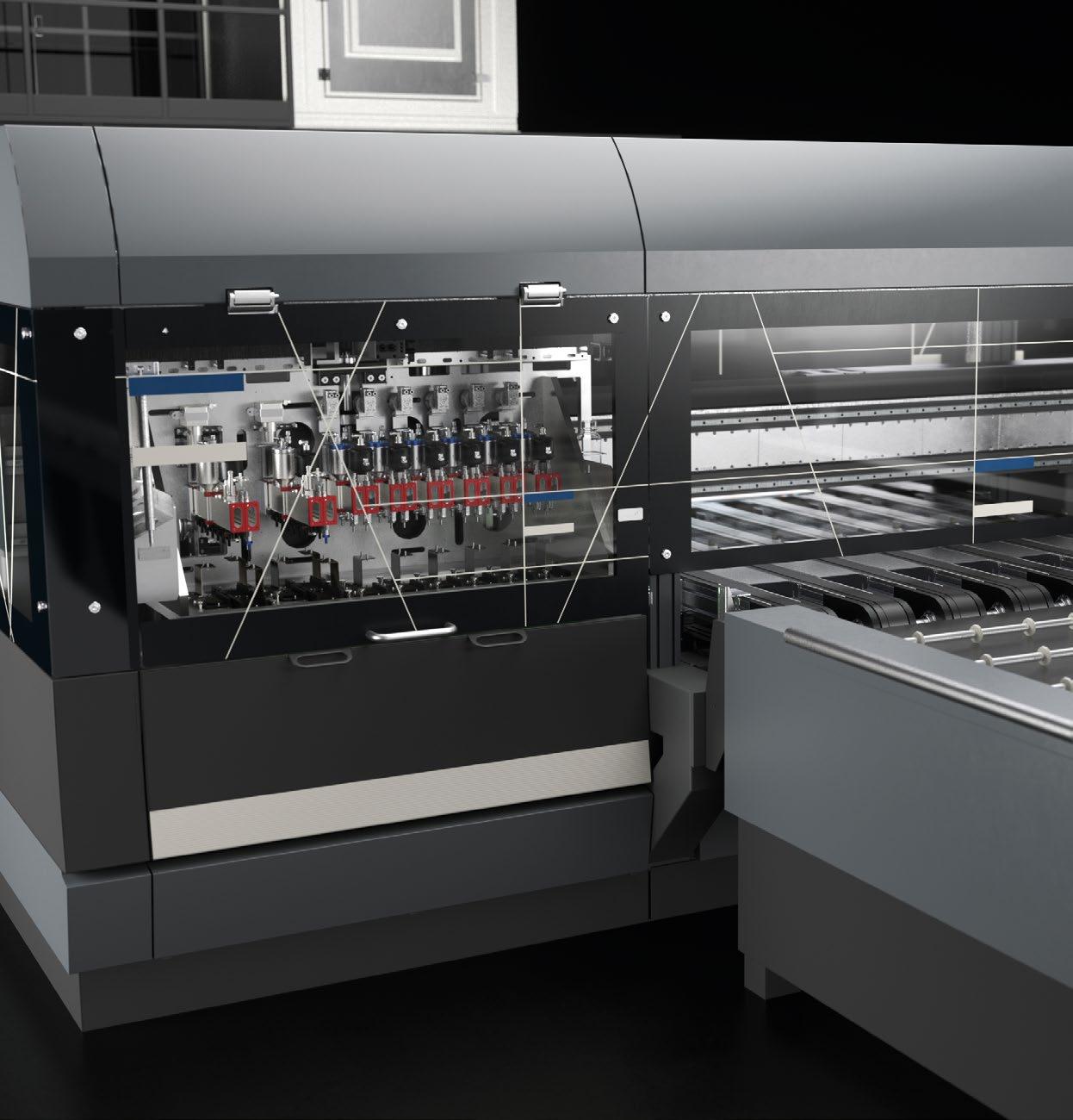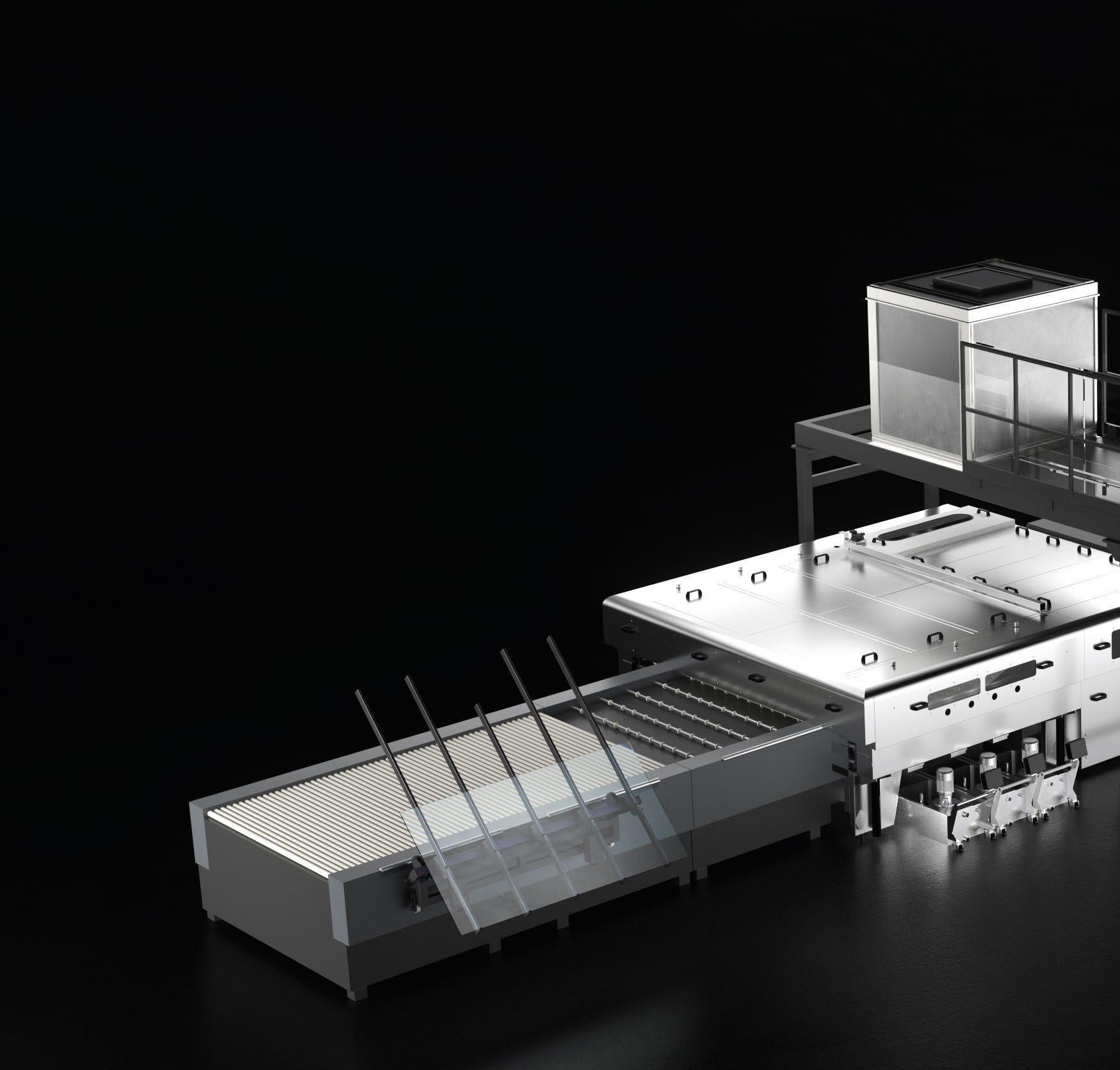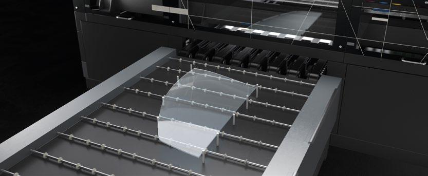 O transporte do vidro durante a impressão ocorre por meio de correias calibradas, controladas e movimentadas por um motor brushless com uma precisão absoluta.