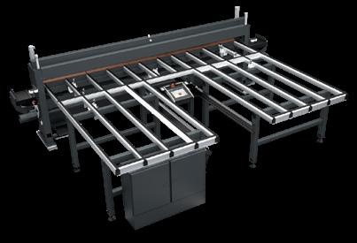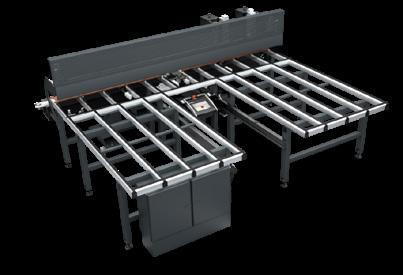Centro di taglio con angoli di taglio programmabili, per il taglio di profili a misura per la produzione di finestre, porte e facciate. Le massime velocità di lavorazione e la massima qualità sono garantite da un‘unità di taglio controllata da un asse. Trasporto in entrata e in uscita con pinza prensile motorizzata regolabile in continuo.