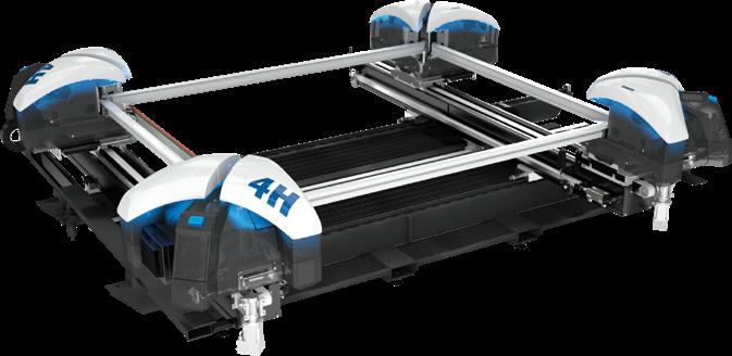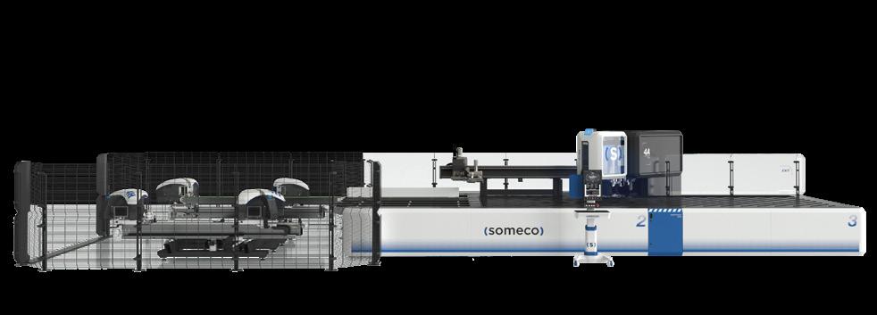 Linea di lavoro automatica CNC fino a 25 assi a barra passante, per fresatura, foratura, taglio, contornatura e avvitatura rinforzi.
