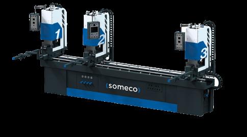 Centro di taglio con 3 unità fisse per tagliare profili di porte e finestre -45°/90°/+45°. La rotazione pinza a controllo CN da 0° a 360° consente di bloccare il profilo nella posizione che meglio garantisce la stabilità del pezzo durante le lavorazioni, il movimento in X della pinza è garantito da motori lineari. Il processo di taglio è ottimizzato per la riduzione degli scarti e i sensori di misurazione integrati rilevano i pezzi residui.