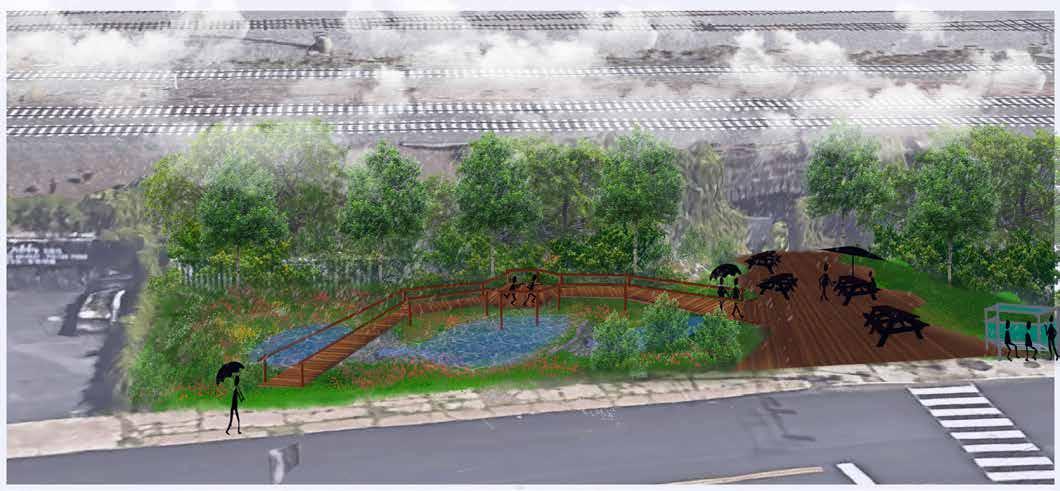 The key site for all reccommended implementations for the Lancaster Avenue Stormwater Management Framework is the Tunnel Lot at the intersection of 56th and Lancaster. For this, the GSI system implemented is somewhere between a rain garden and a wetland with a series of detention and retention basins that flow into each other and ultimately into the actual tunnel, where it floods regardless in every storm event. The basins are not only managing the water, but also allow for a walkable park and observation plaza that could also be used for recreational activities such as hanging with teenage friends, partaking in the multiple carry-out options in the immediate area (Strip Mall, Dibb’s BBQ, etc.) and a refuge from the busy corridor of Lancaster Avenue.