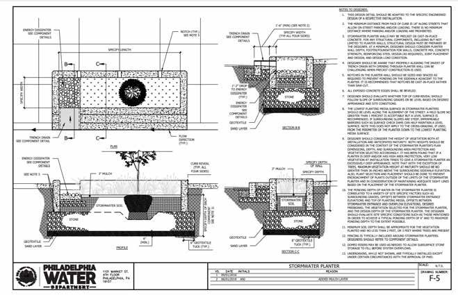 In the appendix (please refer to pages 23-33 of this report) there is a sample of construction Computer-Aided Design (CAD) details that one should see in the plans for GSI implementations from the Philadelphia Water Department. The Overbrook Environmental Education Center can refer to these details to verify that stormwater will be properly managed upon implementation of GSI projects.