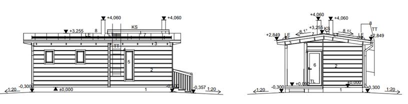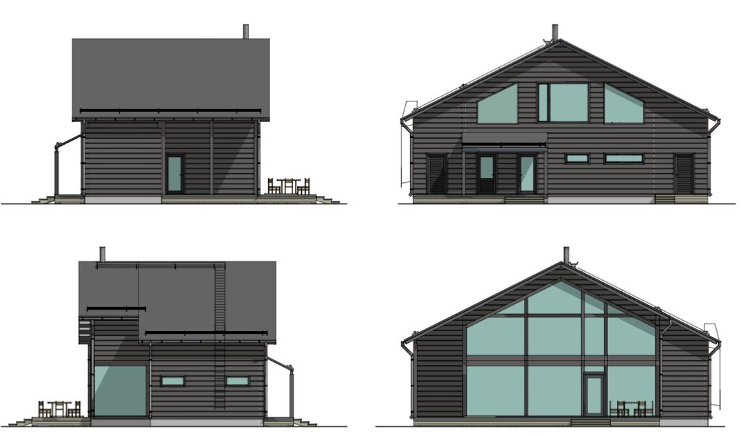 luonnossuunnitelma170m2vapaa-ajan asunnosta,johonasiakashalusikuvanlaiset ikkunat.Alempanaon84m2kokoinen vapaa-ajanasunto.Luonnoskuvistatehtiin sekävärillisetettämustavalkoisetkuvat, 3D-kuvatsekäBimx-malli.