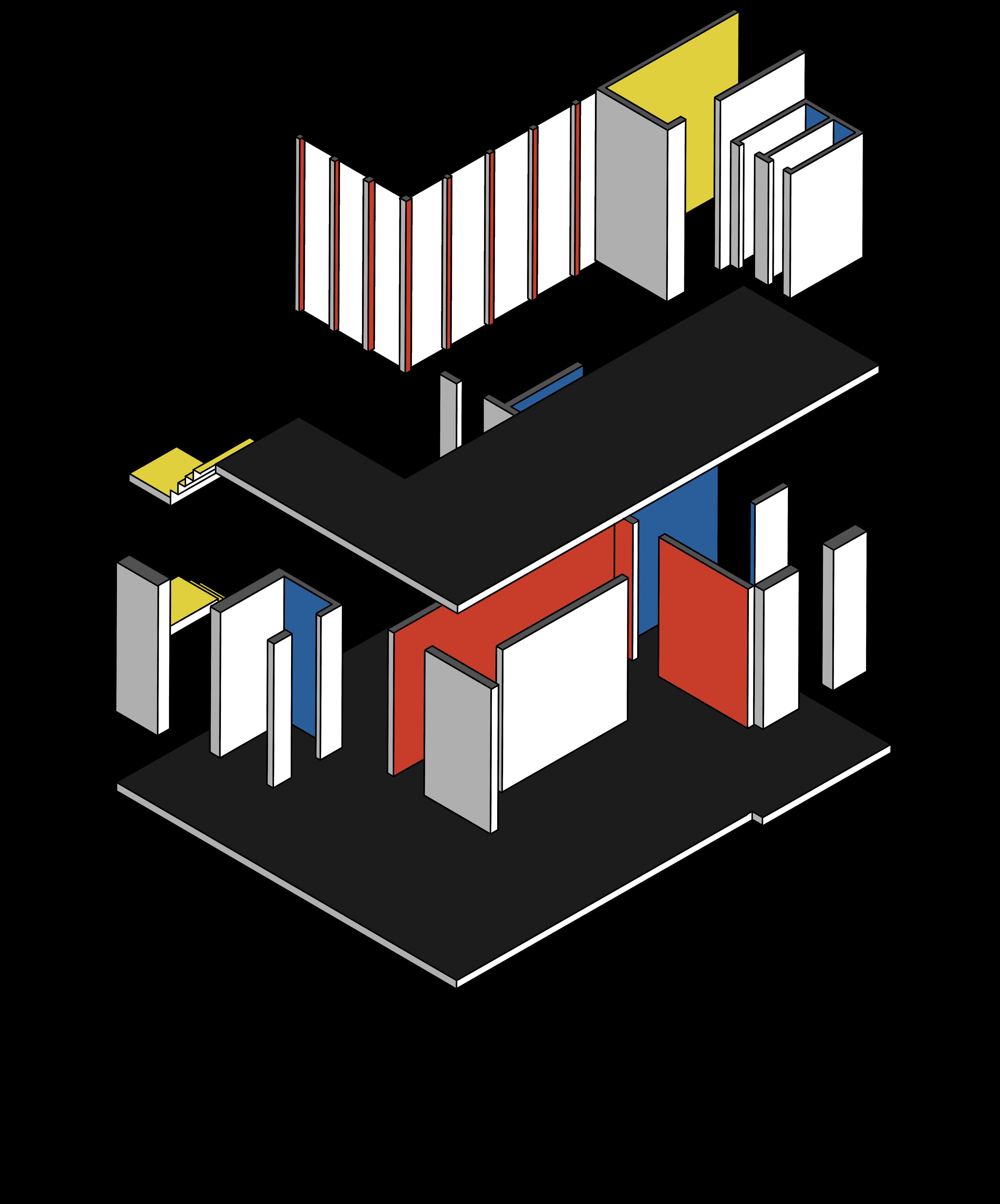 Inspired by the De Stijl Art movement and its abstraction of forms and colours. Using the De stijl colour scheme i coded the key spaces in the main venue of my visitor centre. Public Private Social