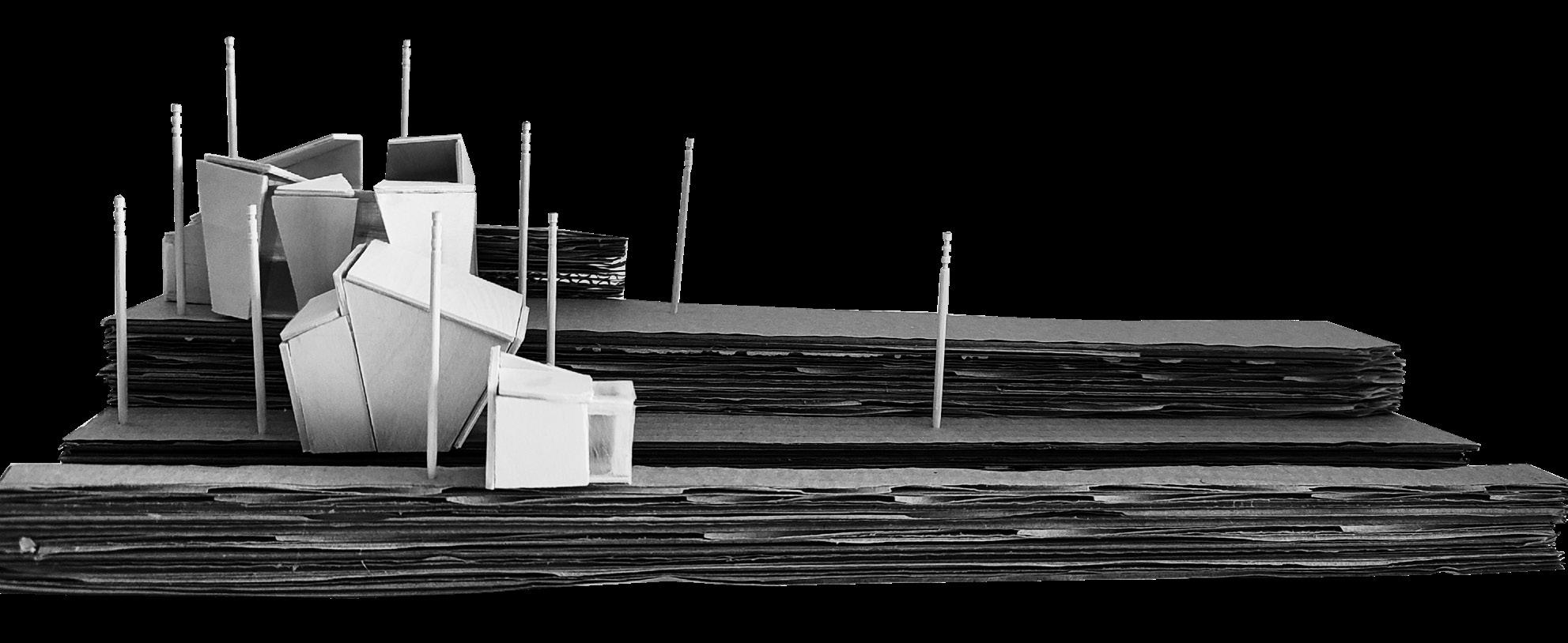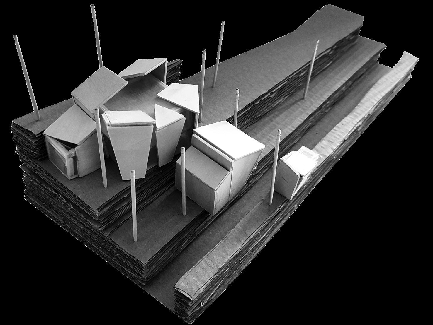 I used cardboard for the site to replicate it's rough topography and a combination of basswood and plastic acetate for the main building.