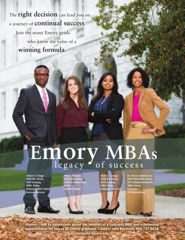 Alumni—talk to Admissions about the benefits of a Goizueta MBA and scholarship opportunities for you as an Emory graduate. Contact Julie Barefoot, 404-727-6638. magazine WINTE R 2013 Goizueta.emory.edu