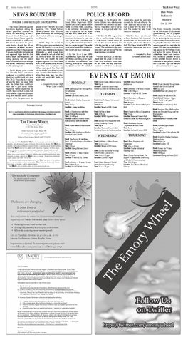 Dobbs University Center, Room 540 605 Asbury Circle, Atlanta, GA 30322 Business (404) 727-6178 Editor-in-Chief Arianna Skibell (404) 727-0279 Founded in 1919, The Emory Wheel is the financially and editorially independent, student-run newspaper of Emory University in Atlanta. The Wheel is a member publication of Media Council, Emory’s organization of student publications. The Wheel reserves the rights to all content as it appears in these pages, and permission to reproduce material must be granted by the editor in chief. The Wheel is published twice weekly on Tuesdays and Fridays during the academic year, except during University holidays and scheduled publication intermissions. A single copy of the Wheel is free of charge. To purchase additional copies, please call (404) 727-6178. The statements and opinions expressed in the Wheel are those of the authors and do not necessarily reflect those of the Wheel Editorial Board or of Emory University, its faculty, staff or administration. The Wheel is also available online at www.emorywheel.com.