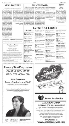 Dobbs University Center, Room 540 605 Asbury Circle, Atlanta, GA 30322 Business (404) 727-6178 Editor in Chief Arianna Skibell (404) 727-0279 Founded in 1919, The Emory Wheel is the financially and editorially independent, student-run newspaper of Emory University in Atlanta. The Wheel is a member publication of Media Council, Emory’s organization of student publications. The Wheel reserves the rights to all content as it appears in these pages, and permission to reproduce material must be granted by the editor in chief. The Wheel is published twice weekly on Tuesdays and Fridays during the academic year, except during University holidays and scheduled publication intermissions. A single copy of the Wheel is free of charge. To purchase additional copies, please call (404) 727-6178. The statements and opinions expressed in the Wheel are those of the authors and do not necessarily reflect those of the Wheel Editorial Board or of Emory University, its faculty, staff or administration. The Wheel is also available online at www.emorywheel.com.