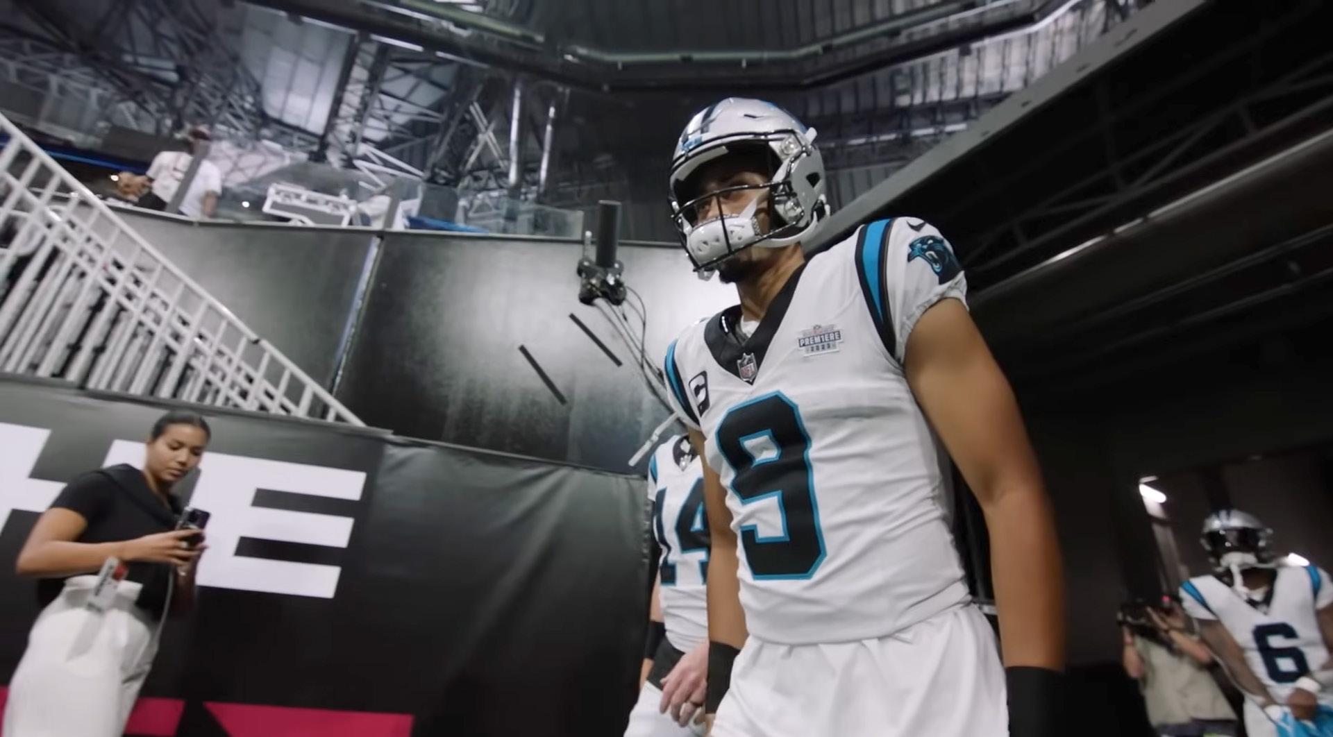Carolina Panthers quaterback Bryce Young prepares to lead his team out of the tunnel before a game in 2023.