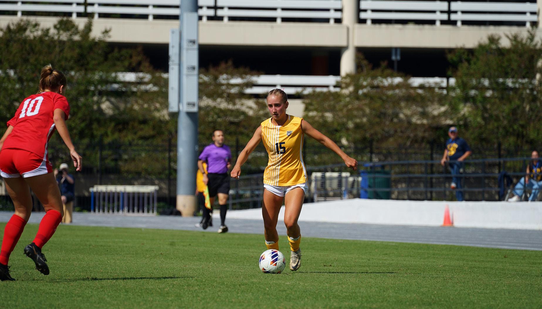 Senior defender Claudia Schmidt carries the ball during a game against Washington University in St. Louis (Mo.) on Oct. 5. Emory lost 2-1.
