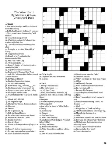 The Wise Heart By Miranda Wilson, Crossword Desk ACROSS 1. How someone might scold on the fourth floor of the library 4. Public health agency by Emory’s campus 7. Sheet music instruction meaning “with the bow” 11. Sound from a dog or wolf 12. What the report card of a Dean’s List student might look like 13. Goatherd who discovered the coffee plant 15. Belonging to a certain Robert W. of Emory 17. Happen another time 18. Branch of gov’t containing the Commander in Chief 19. Anti-, uni-, extra-, e.g. 21. “Be there in just a __” 22. Emory’s chapter of a student physics association (abbr.) 23. Adjective for an eavesdropper 24. Equipment of Emory’s Crew Team 27. 14th chief minister of the Indian state of Andhra Pradesh 28. Birthplace of Emory 30. Ending of some street names 33. An extra seed-covering 36. Bill Withers’ song, “Just the __ _ Us” 38. Stocking surprise for an unruly kid 39. Common government website ending 40. Civil rights activist Parks 41. What the third letter of 30-down stands for 43. Classic BBQ side dish 45. An auspicious sign 46. The Spirit of Emory, dismisses classes 48. Hem and __ 50. Deuces 51. Jib or spinnaker, e.g. 53. Title for Carmel Fenves 56. Peruvian-American soprano Sumac 58. Product of Nikon and Canon 60. Sound of surprise 61. Bird of 1-down 64. Where an Emory student might go for a stroll 66. Emory’s student-run newspaper 67. Focused computer languages (abbr.) 68. Score that leads to overtime