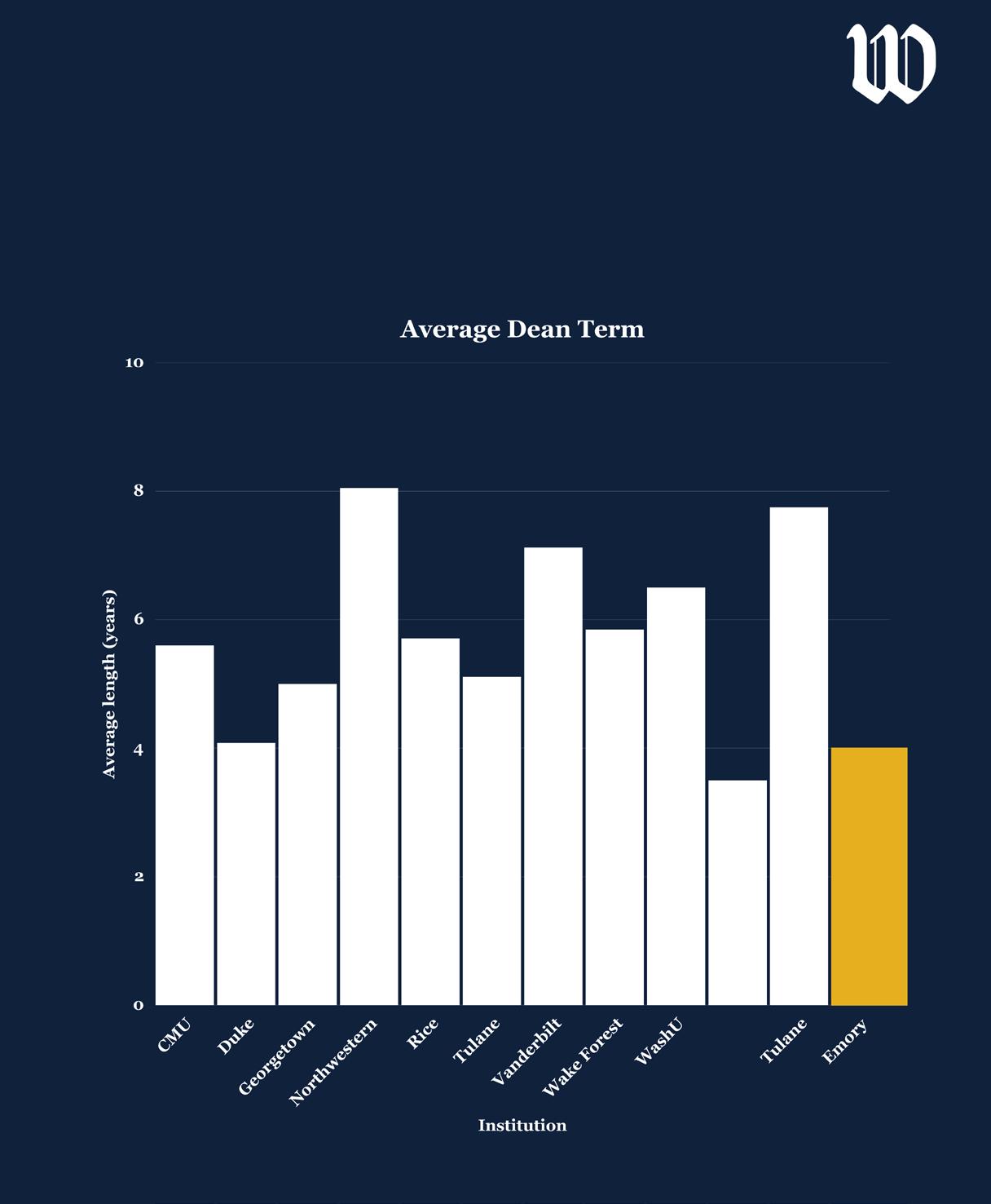 Of all universities surveyed, Northwestern University (Ill.) deans, excluding interims, had the longest average tenure of deans at 8.05 years served. In comparison, Duke University (N.C.) had the lowest average tenure outside of Emory at an average of 4.08 years served.