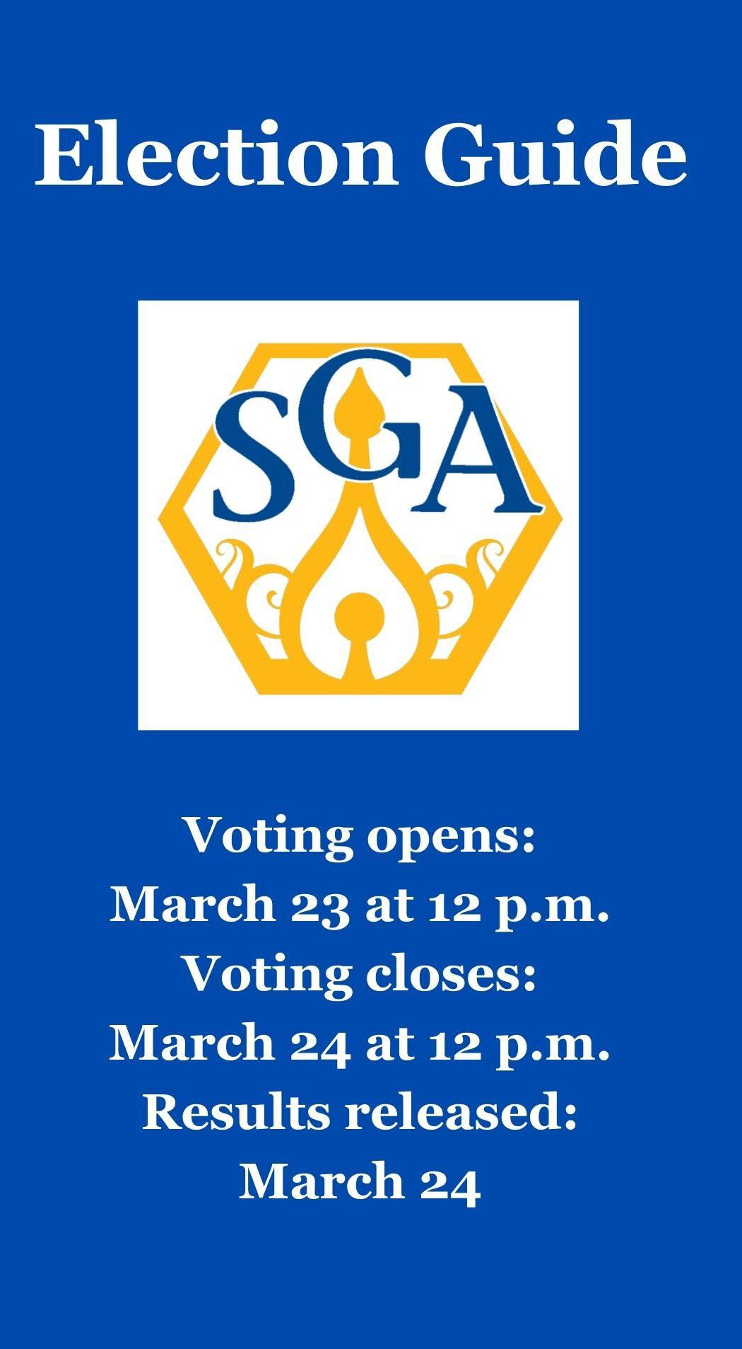In the 2024 SGA presidential election, Abigail Dubinski (25B) beat Jayden Davis (25B). Dubinski received 1,059 (56.93%) of the 1,860 votes cast, and Davis received 561 (30.16%) of the votes.