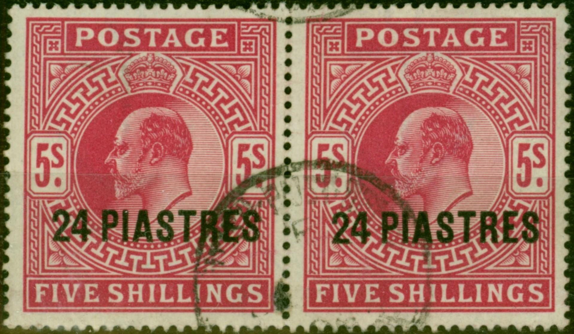 British Levant 1905 24pi on 5s Bright Carmine SG12 V.F.U Pair
