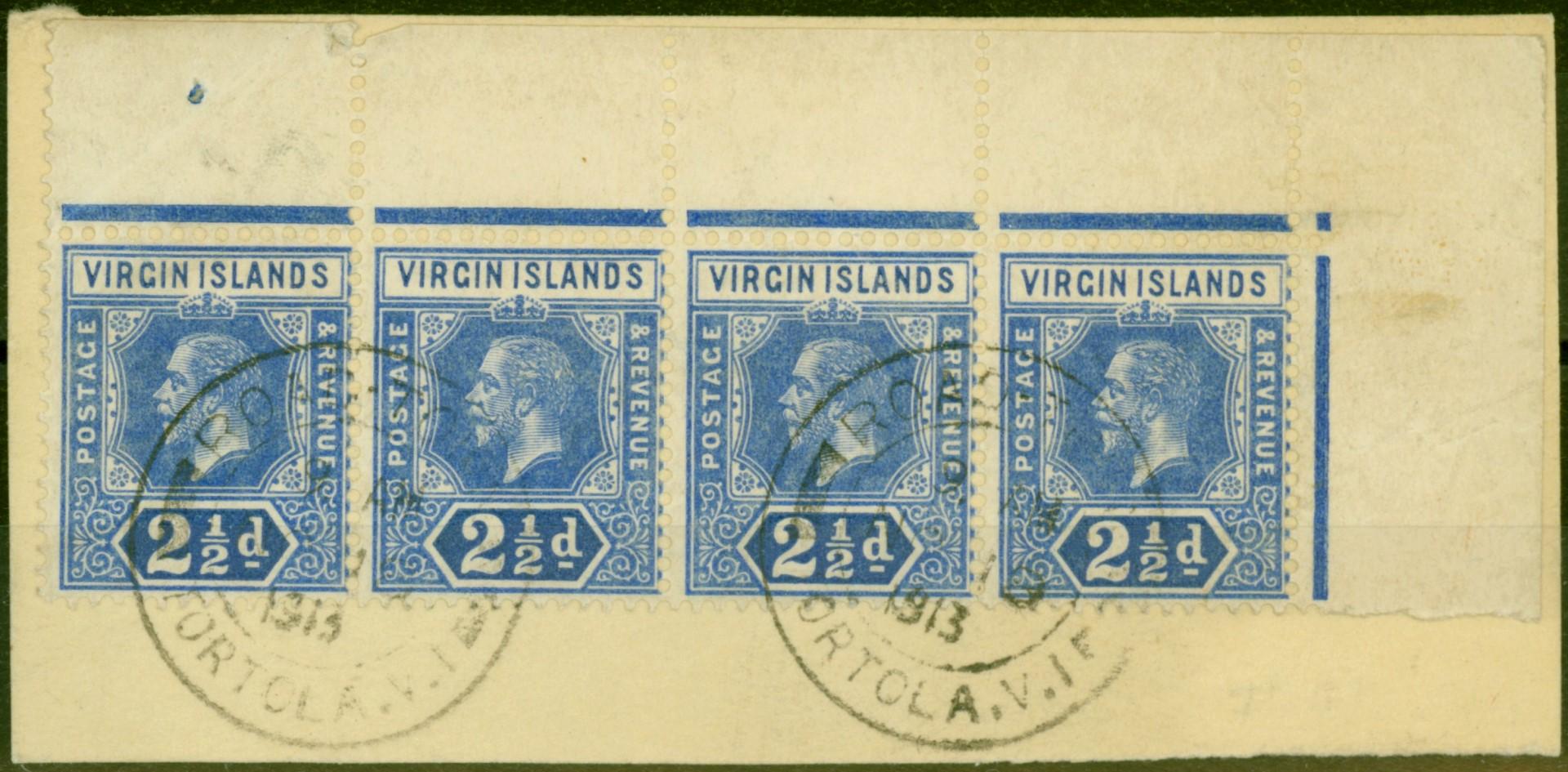 Virgin Islands 1913 2 1/2d Bright Blue SG72 Superb Used Strip of 4 on Piece