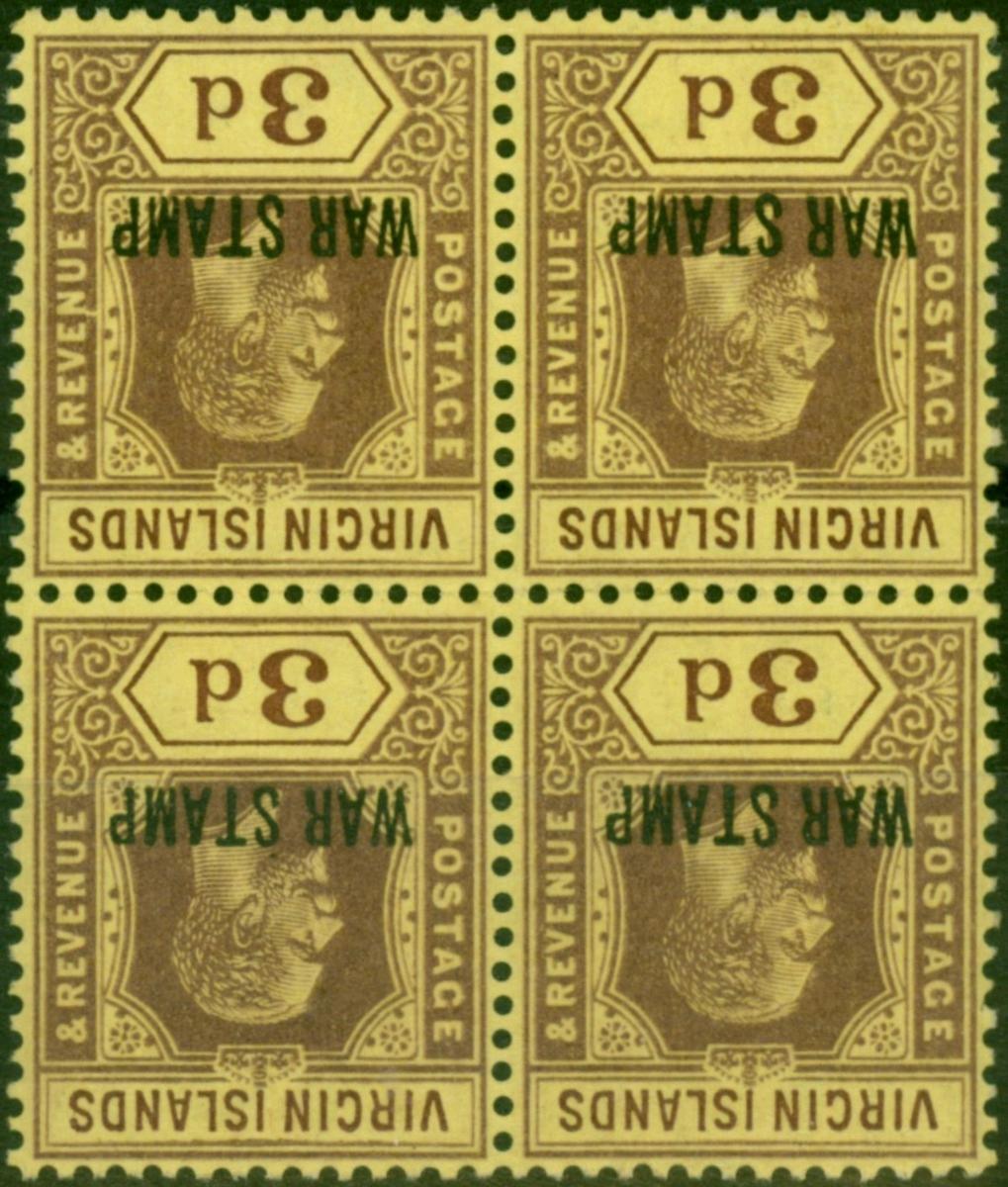 Virgin Is 1916 War Stamp 3d PurpleBuff-Yellow SG79bw Wmk Inverted V.F MNH Block of 4