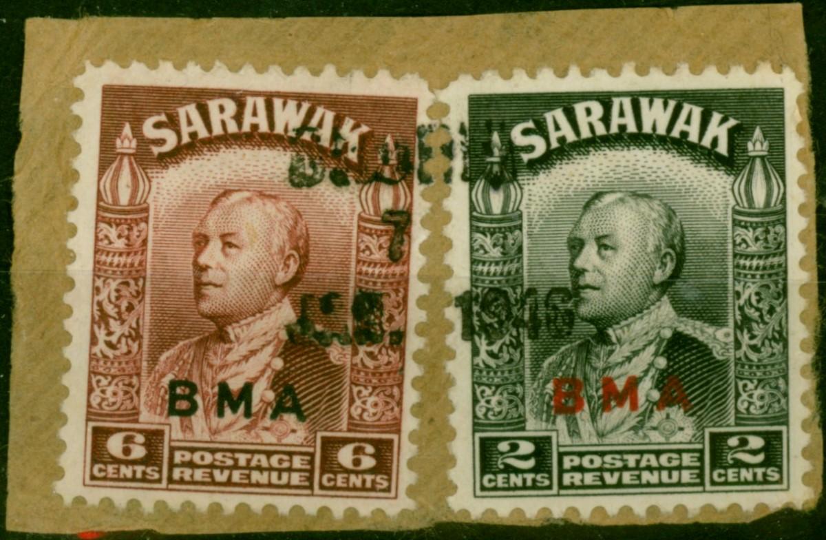 Brunei 1945 6c + 2c BMA of Sarawak SG127-131 with Local Opt on Piece
