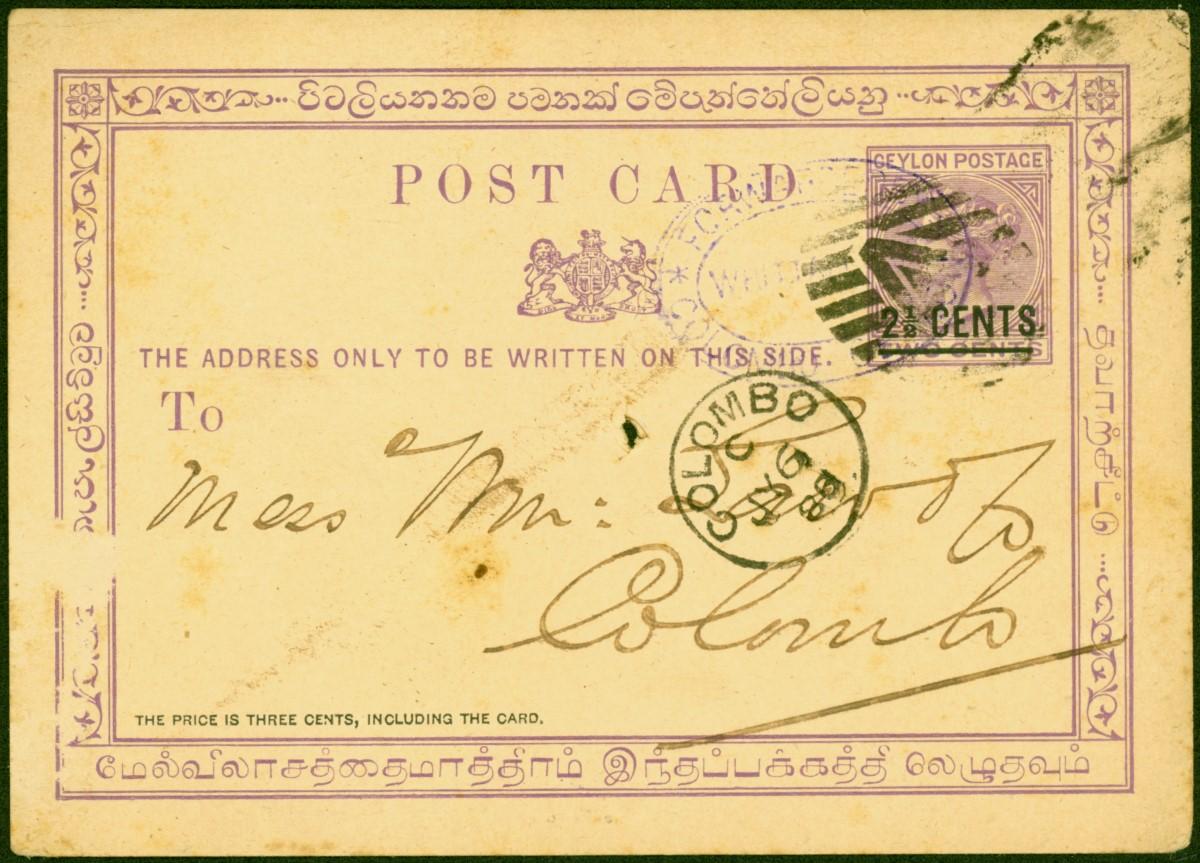 Ceylon 1886 2 1/2c on 2c Pre-Paid Postcard to Colombo Good