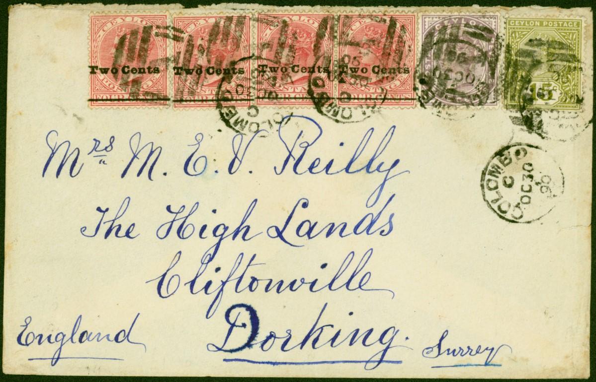 Ceylon 1890 Cover to Dorking Bearing SG203 x 4, SG195 & SG196 Fine & Attractive