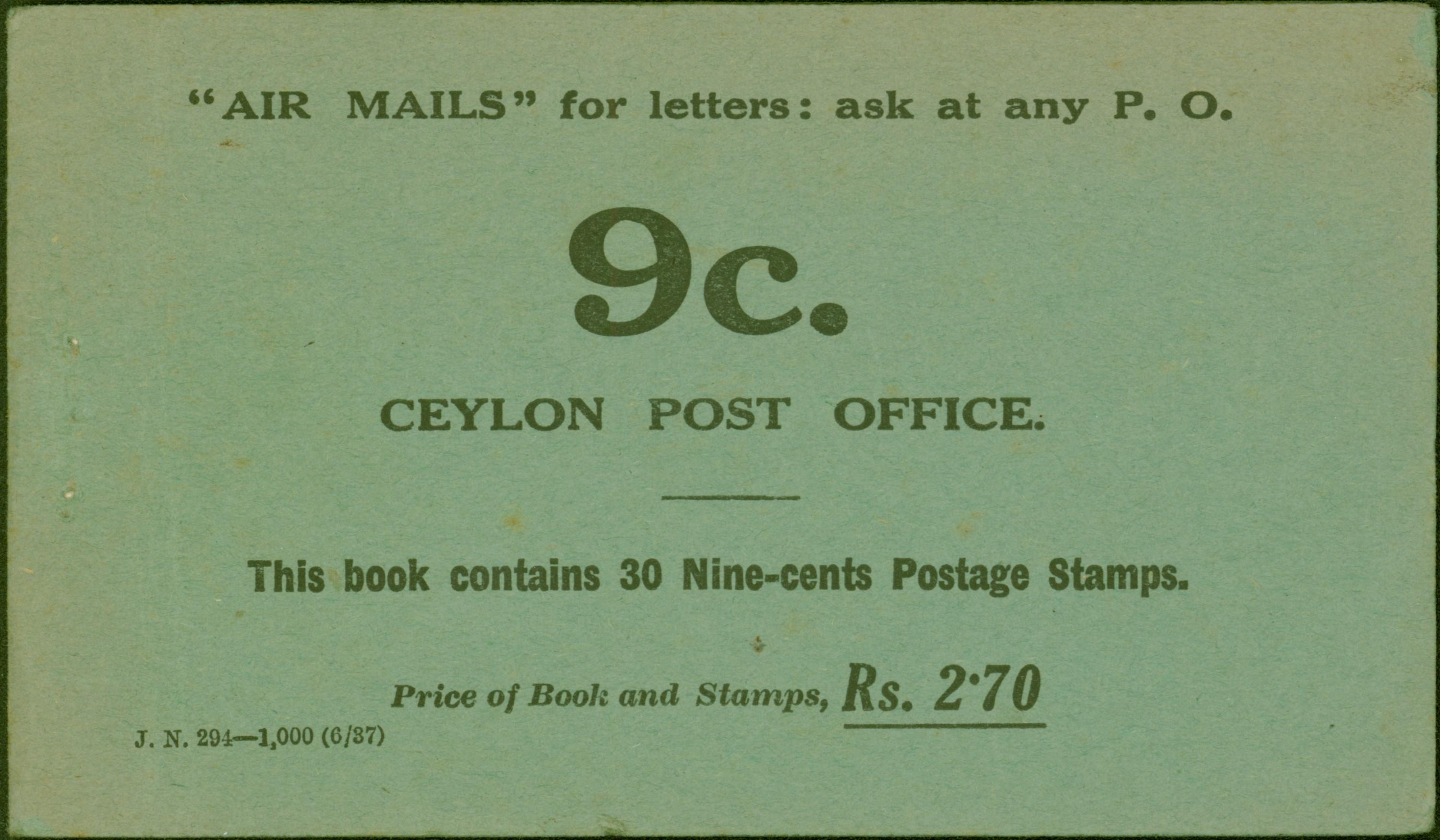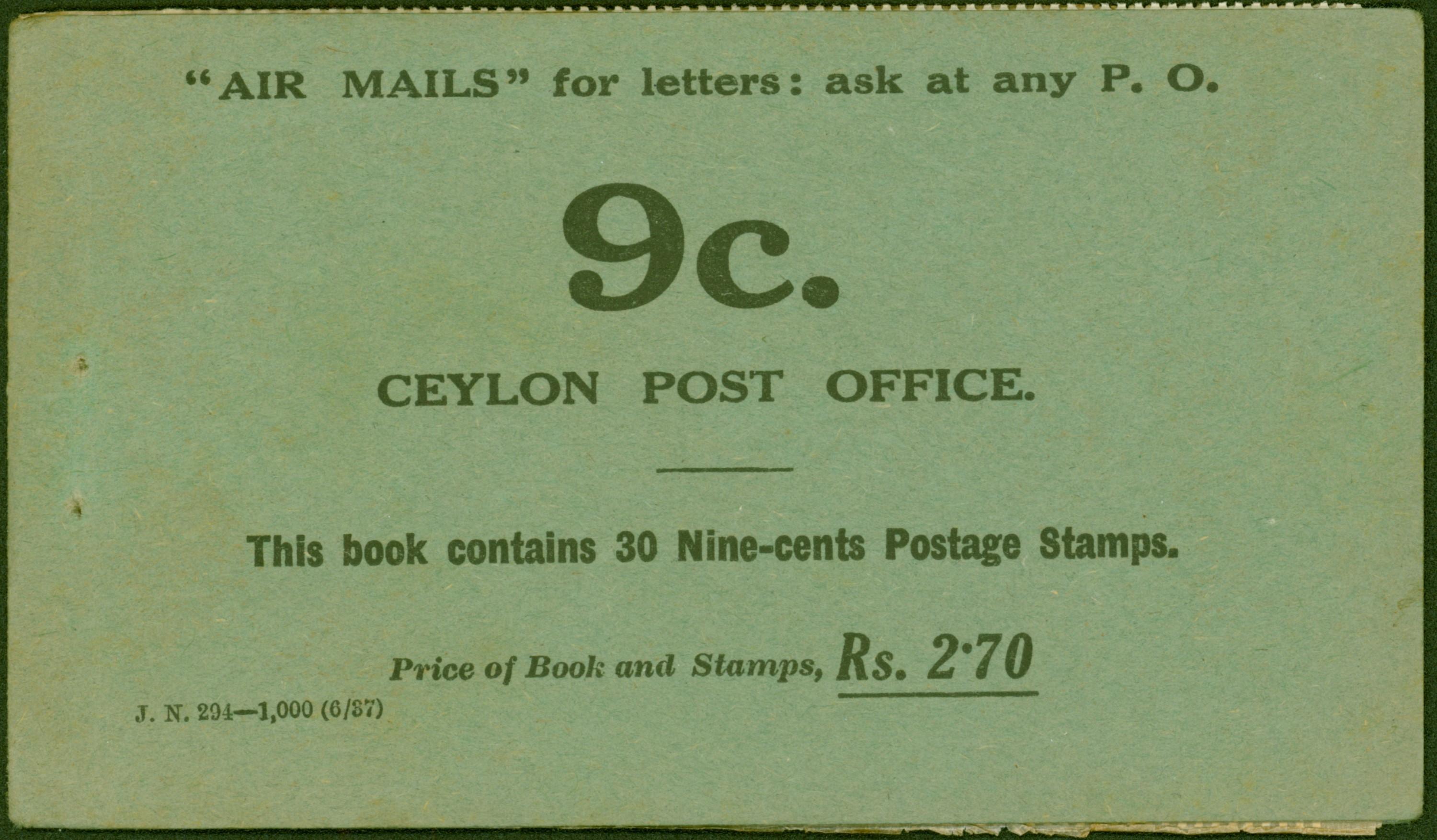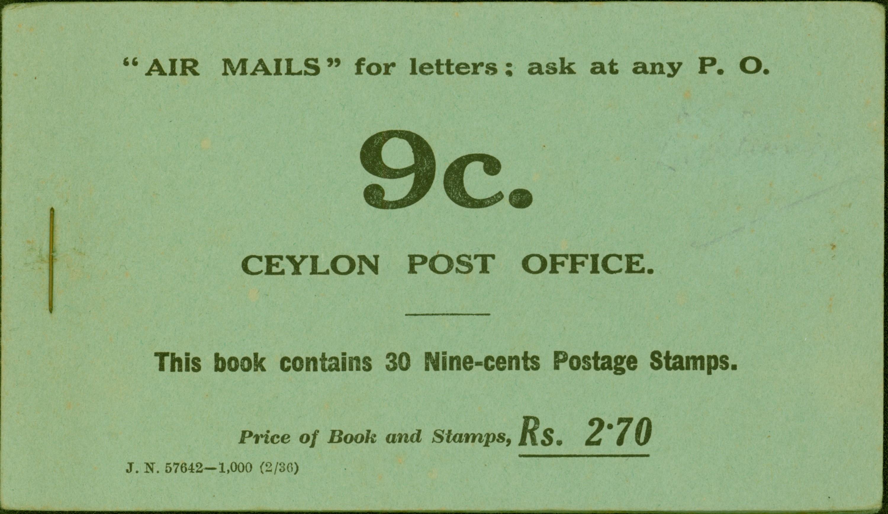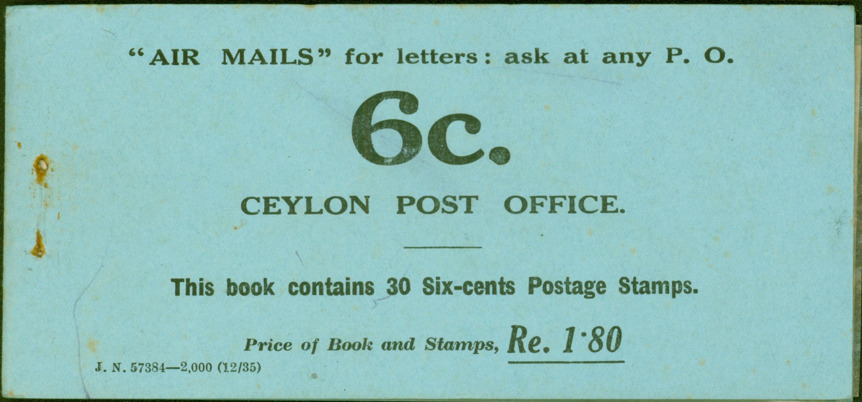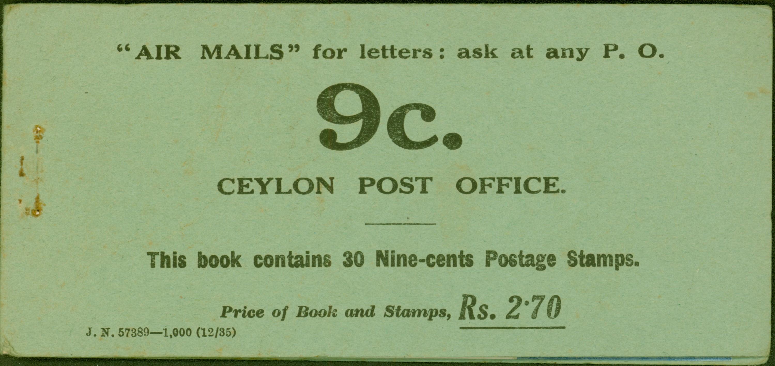 Ceylon 1935 2R.70 Booklet SGSB14 J.N 57389-1,000 (12-35) Containing 30 x 9c in Blocks of 6 Extremely Rare