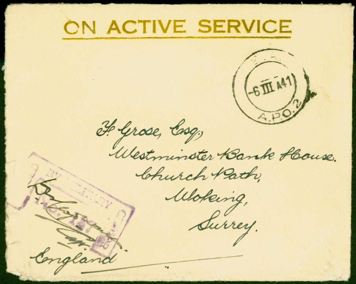 Somaliland WWII 1941 On Active Service Field Post Cover to Surrey Fine