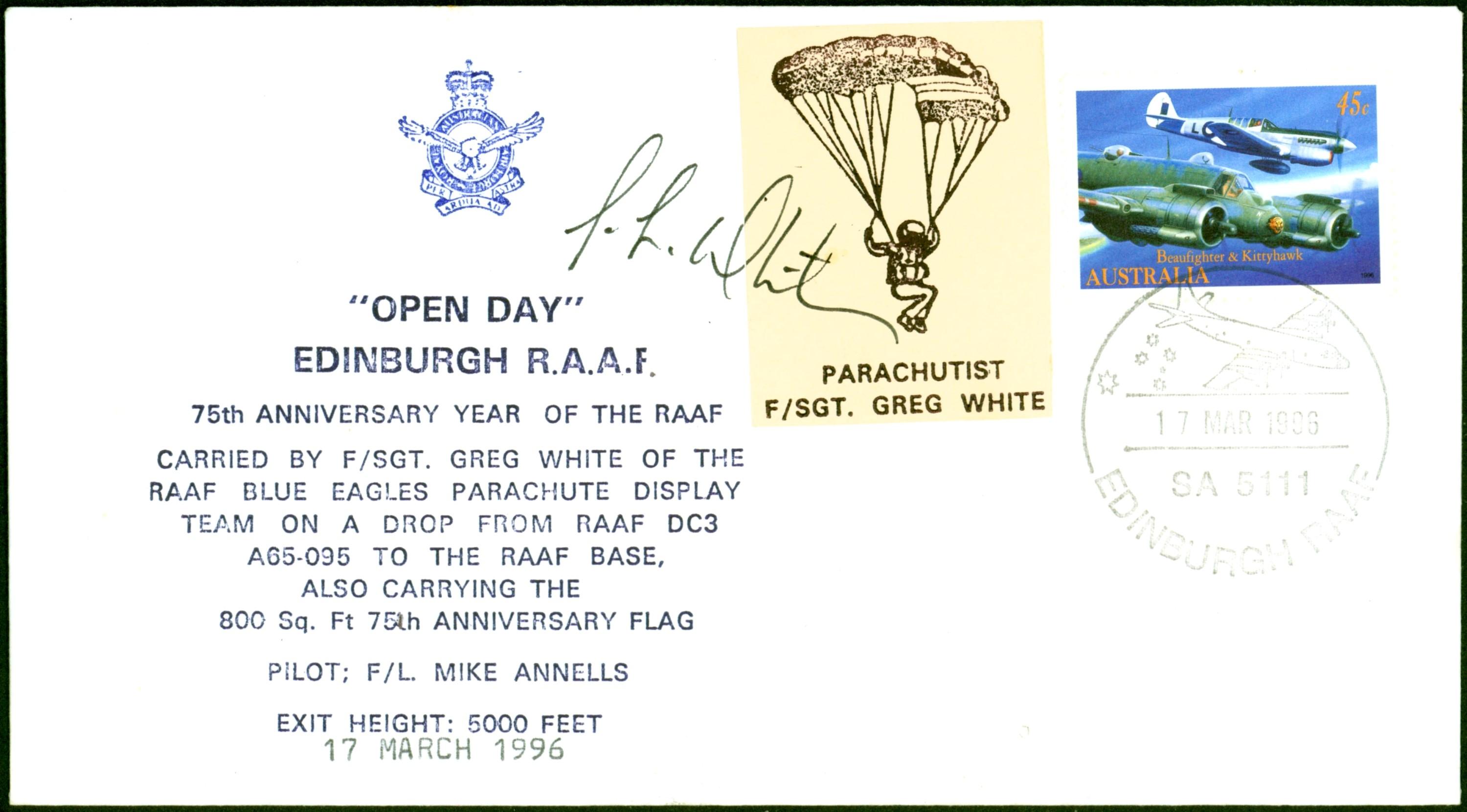 Australia 1996 Edinburg R.A.A.F Parachute Mail Signed Greg White