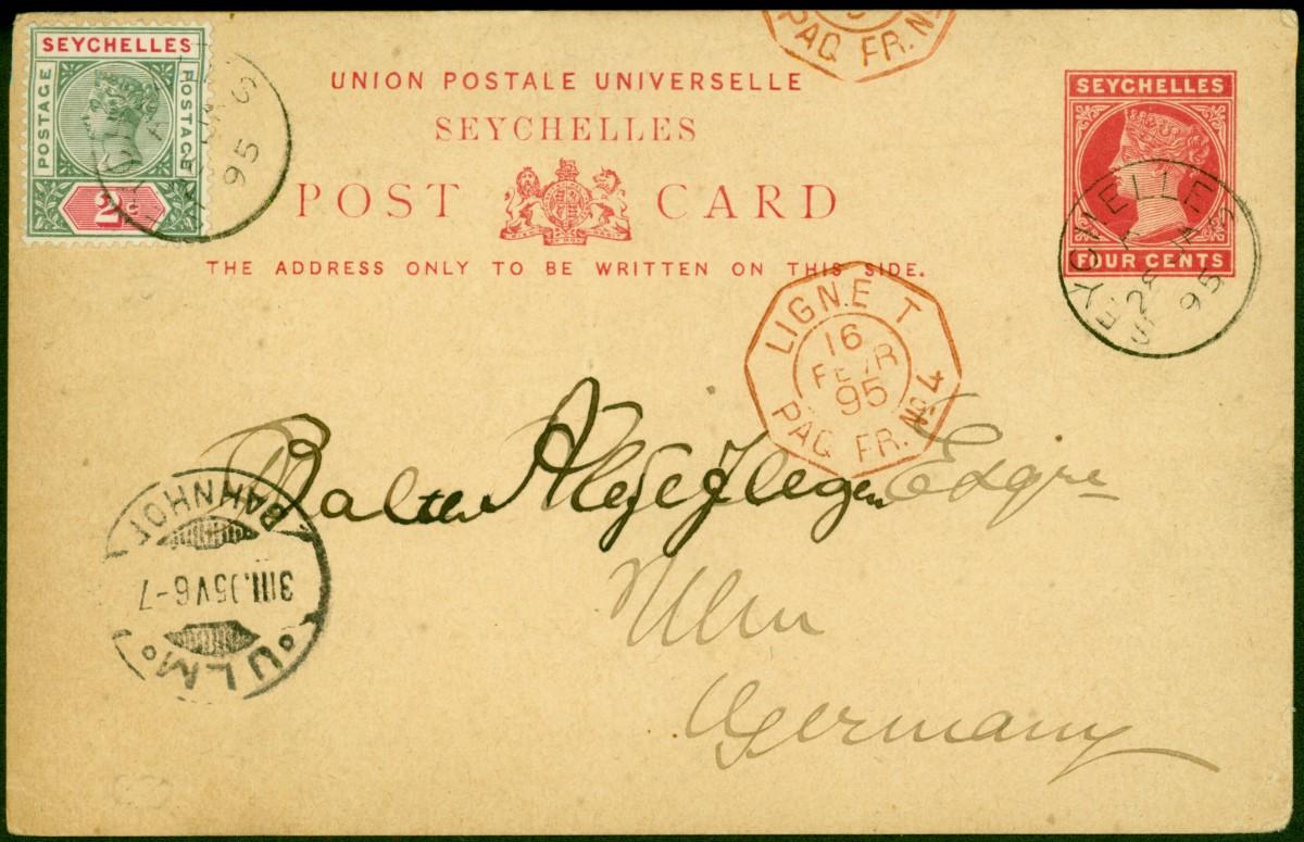 Seychelles 1895 Rare 4c Postcard Uprated with 2c SG9 to Germany 'Paquebo Ville De Ciotat' V.F & Attractive