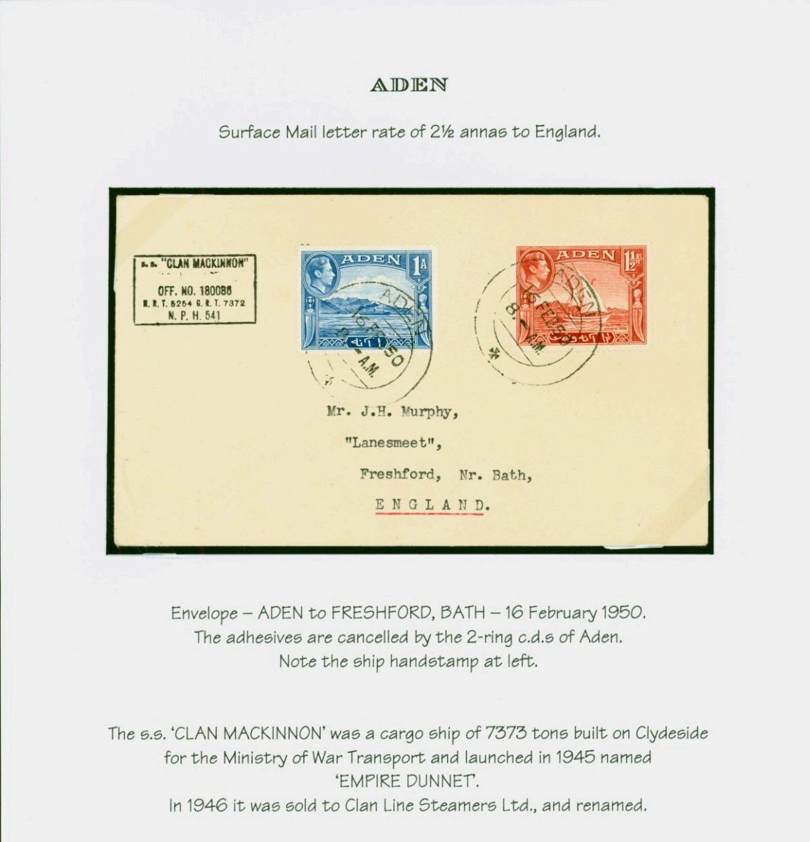 Aden 1950 Surface Mail Letter to Freshford on Exhibition Page Superbly