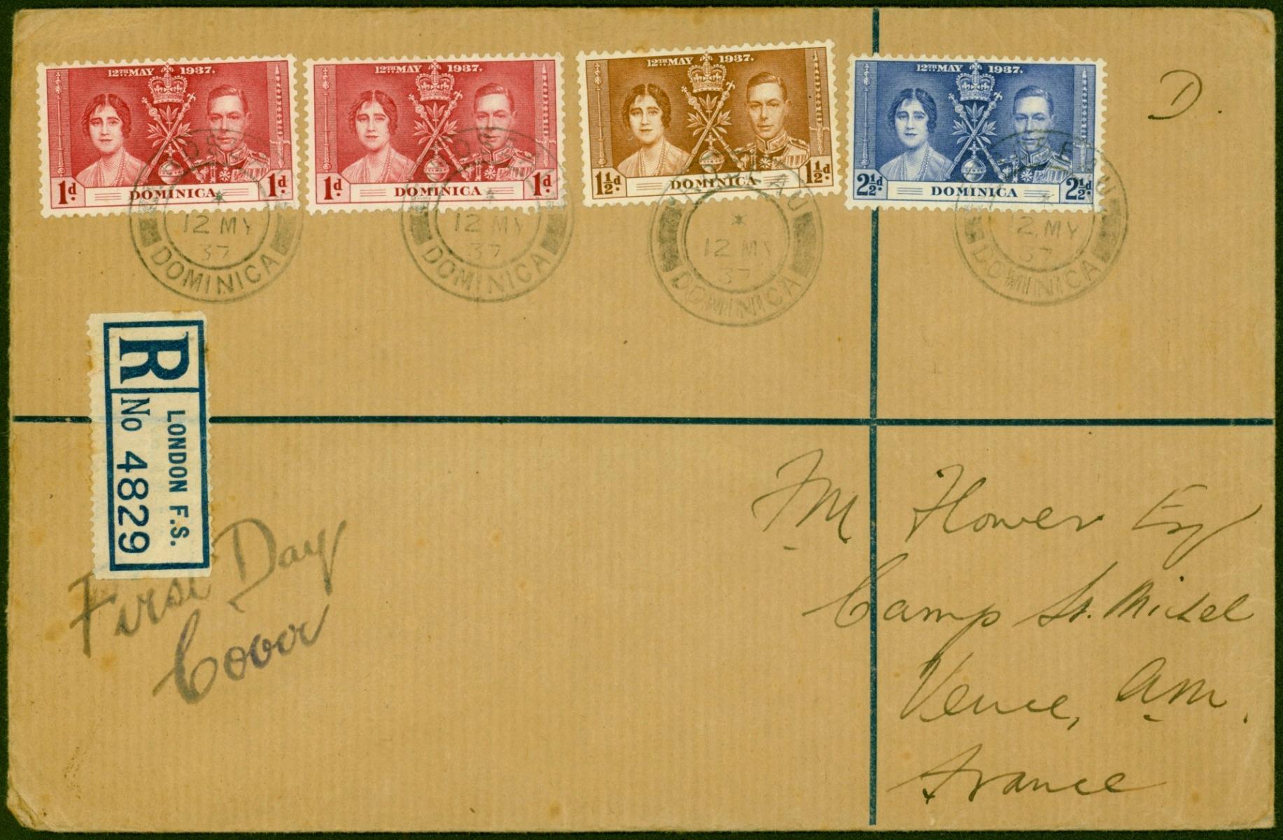 Dominica 1937 Coronation Set of 3 with Additional 1d Registered Cover to France