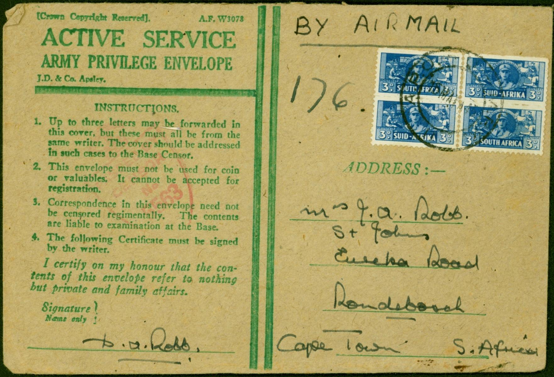 South Africa 1945 Active Service Army Privilege Envelope to Cape Town Passed by Censor Fine (3)