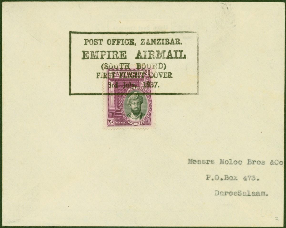 Zanzibar 1937 1st Flight Cover to Daressalam Bearing 20c Jubilee Special Flight
