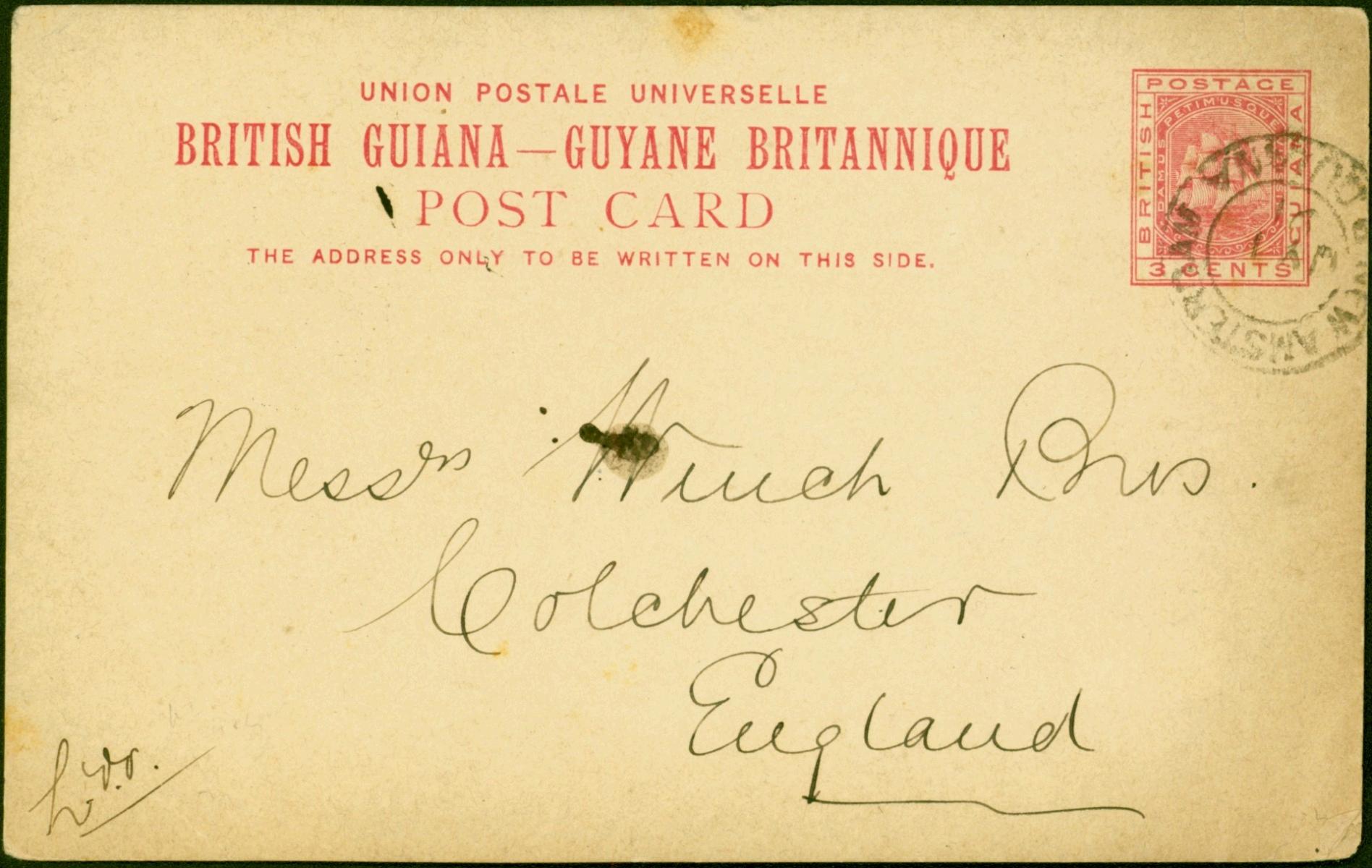 British Guiana 1891 3c Pre-Paid Postcard to England Fine & Attractive