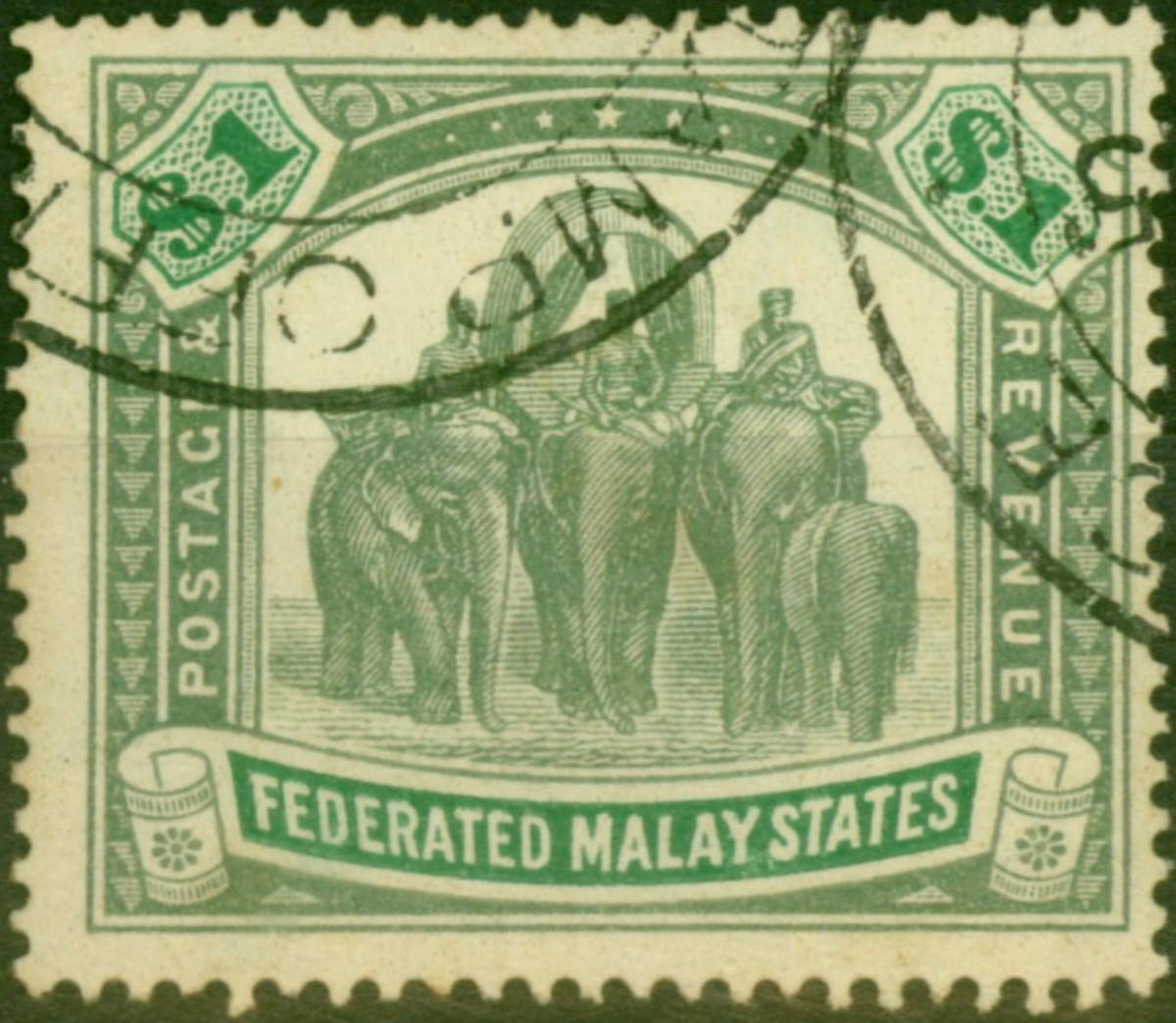 Fed of Malay States 1907 $1 GreyGreen & Green SG48 Fine Used Fiscal Cancel